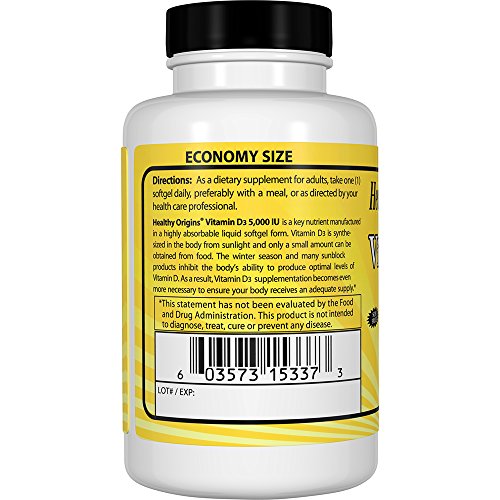 Healthy Origins Vitamin D3 5,000 IU is a key nutrient manufactured in a highly absorbable liquid softgel form. Vitamin D3 is synthesized in the body from sunlight and only a small amount can be obtained from food. The winter season and many sunblock products inhibit the body's ability to produce optimal levels of Vitamin D. As a result, Vitamin D3 supplementation becomes even more necessary to ensure your body receives an adequate supply.Feature