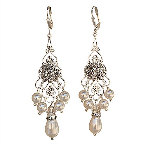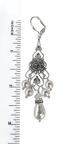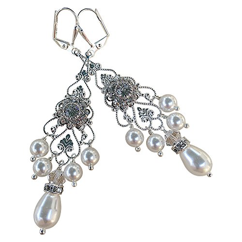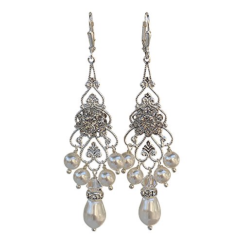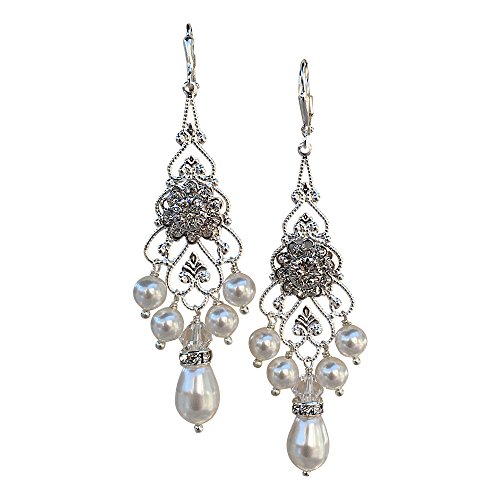 -. Binding : Jewelry -. Brand : HisJewelsCreations -. Department : Womens -. Feature : HisJewelsCreations - Features: Swarovski Elements Rhinestone Flower Centerpiece Silverplate Leverback Earrings Measure Approx. 2 1/2" inches Width 7/8 inches Rhinestone Rondelles Silverplate Vintage Filigree / These earrings are designed with the finest Swarovski White Pearls and Flower Centerpiece. Set in a silverplate filigree setting and adorned with rhinestone rondelles. Sweet and feminine, the delicate flower glitters in Clear Swarovski Crystal. The center of the flower is raised to form a beautiful 3D swirl effect. / These earrings lend a soft touch of floral elegance for the wedding day and have lots of sparkle and shine. Swarovski Pearls have a heart of an actual crystal bead that has been finished with layers of highly luminous pearlescence. The result is the look of a fine South Seas pearl, the look that will make your jewelry into timeless heirlooms. / SWAROVSKI ELEMENTS are illuminated in countless colors and effects. The spectrum is continually expanded to include new Swarovski® colors and effects, ensuring innovative and cutting-edge design materials. Swarovski® crystal beads are completely color-permeated, providing consistency of color independent of shape or size. / Meticulously Handmade in USA -. Label : HisJewelsCreations -. Manufacturer : HisJewelsCreations -. ProductGroup : Jewelry -. ProductTypeName : FASHIONEARRING -. Publisher : HisJewelsCreations -. Studio : HisJewelsCreations -. Title : Bridal Vintage Swarovski Silvertone Statement Chandelier Earrings with Pearls and Rhinestones