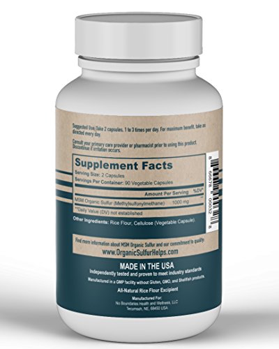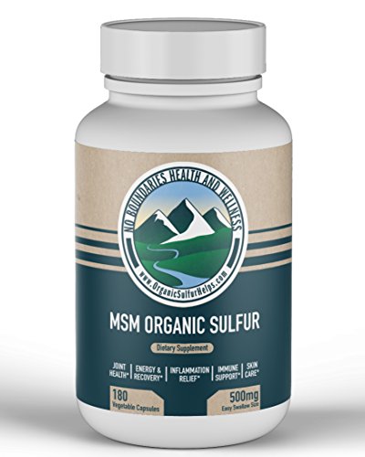 PREMIUM MSM ORGANIC SULFUR CAPSULES (VEGETABLE): Our No Boundaries Health and Wellness MSM Organic Sulfur Capsules are easy to swallow and use an all-natural vegetable capsule that contains 500mg 99.9% pure MSM (methysulfonylmethane) sulfur powder, one of the most crucial nutrients in our bodies. Sulfur can naturally help increase energy, youthfulness and overall health. Our product replaces the synthetic anti-caking agents other sellers use with a certified organic rice flour.