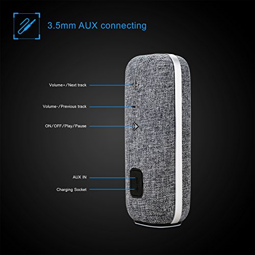 Features: The durable fabric material and rugged rubber housing allow your speaker to outlast all of your adventures including those accidental drops. Super portable yet rugged and yet lightweight. Bluetooth ready, AUX. High capacity rechargeable 2000mAh battery for up to 10 hours of playtime based on music volume.