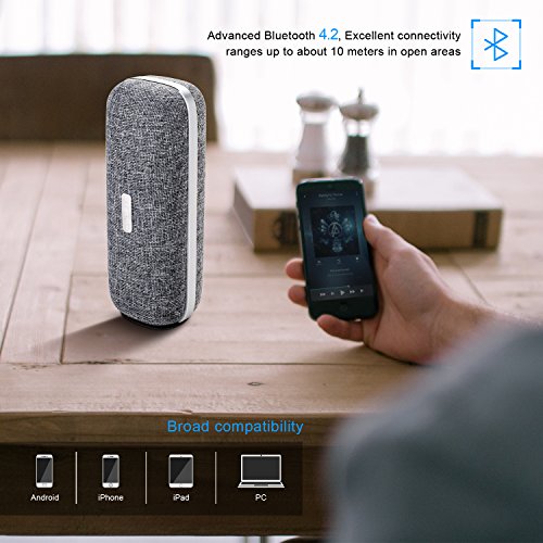 Specification: Wide compatibility: Compatible with almost Bluetooth-capable devices including Apple, iPhone, and iPod, most Android devices and other smart devices. Bluetooth Standard: 4.2 Bluetooth profiles: HFP, A2DP, AVRCP Speaker Unit: 4Ω¸5W x 2 passive radiator x 1 Battery type: Lithium-ion battery Battery capacity: 2000mAH Charging time: 3 hours Stand-by time: 20 hours Connection range: 33 feet Operating frequency: 2.4-2.48GHz Size: 7.8x 3.0 x 2.6 inches Weight: 23 once
