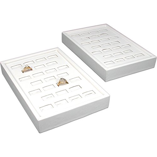 -. Binding : Kitchen -. Brand : FindingKing -. Color : White -. Feature : This is a new set of 2 white faux leather ring displays / Great for displaying jewelry on countertops and showcases / Both holds 25 rings / Each measures approximately 5" x 7 1/2" x 1" (127 x 190.5 x 25 mm) -. Model : F8-1W (2) -. MPN : 58342116 -. PartNumber : 58342116 -. ProductGroup : Jewelry -. ProductTypeName : FASHIONNECKLACEBRACELETANKLET -. Title : 2 White Leather 25 Slot Ring Display Trays Jewelry Case