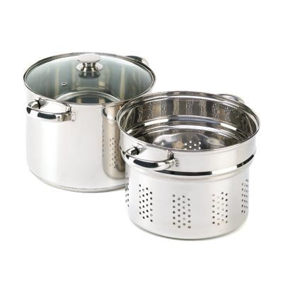 From pasta to soups, this versatile stock pot makes gourmet cooking a breeze! Multipurpose 8-quart set lets you steam, boil and cook up all your favorites.