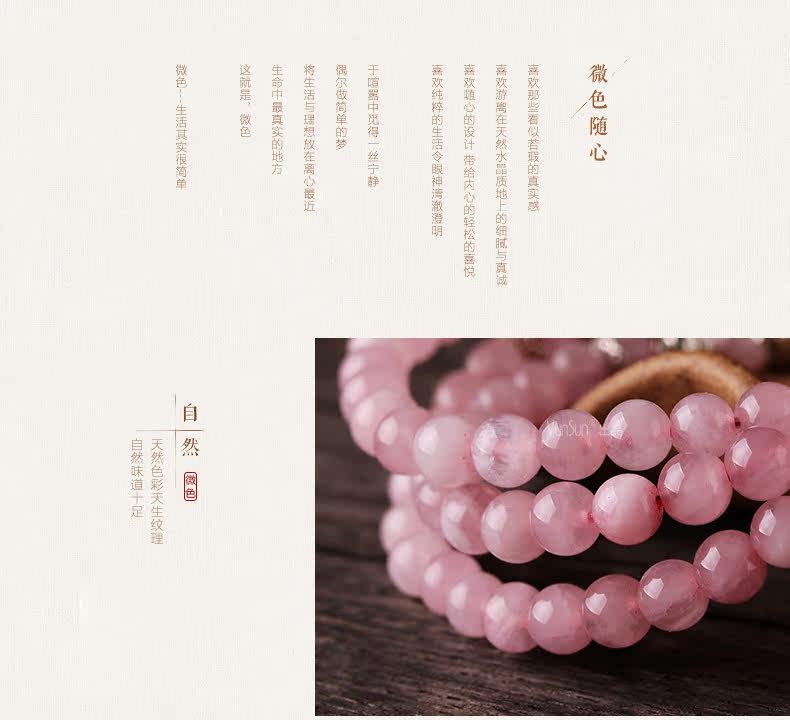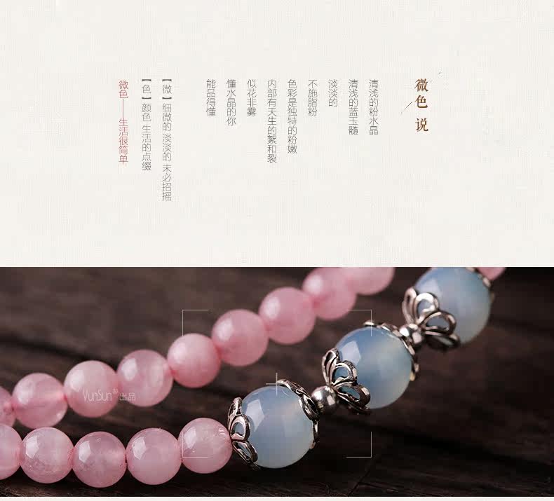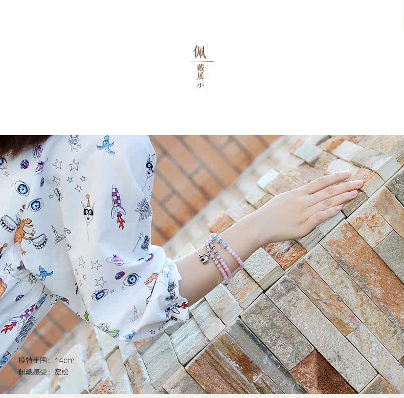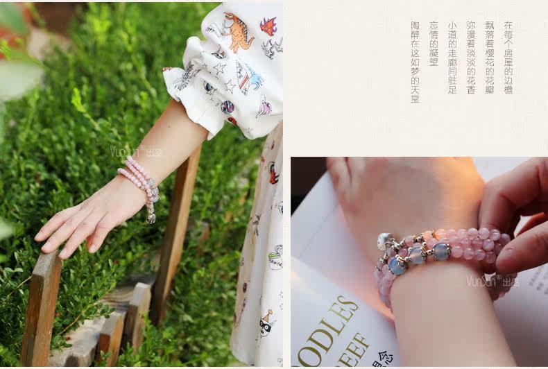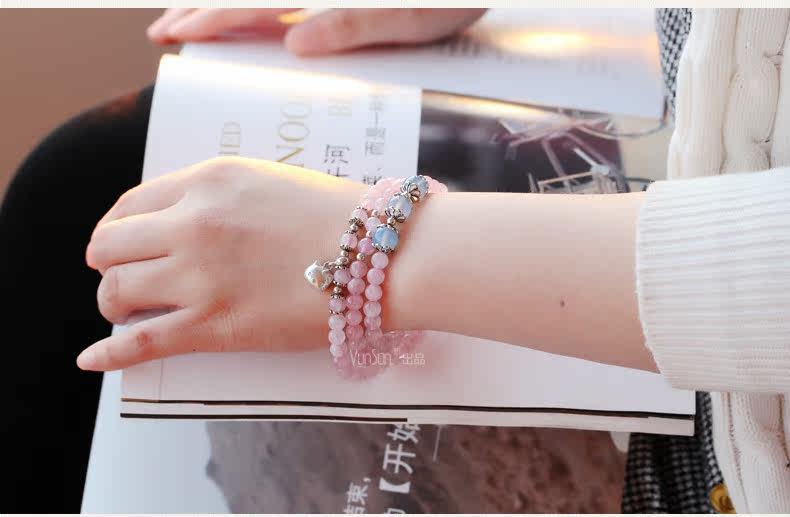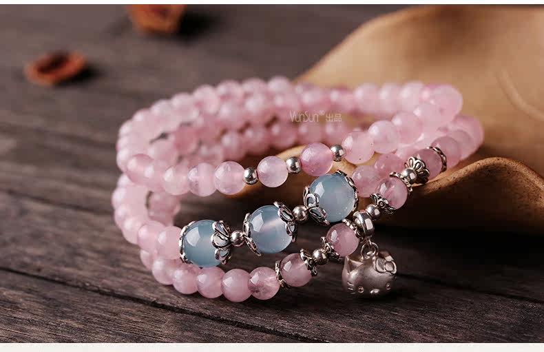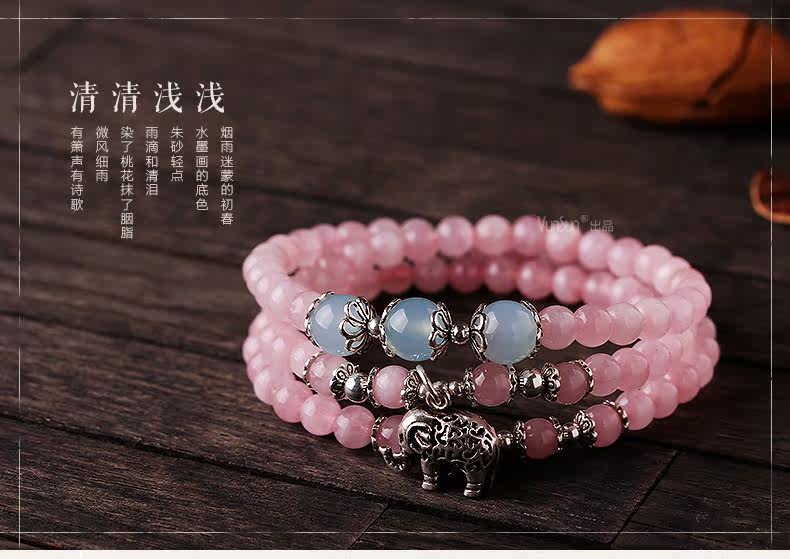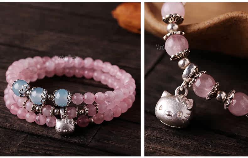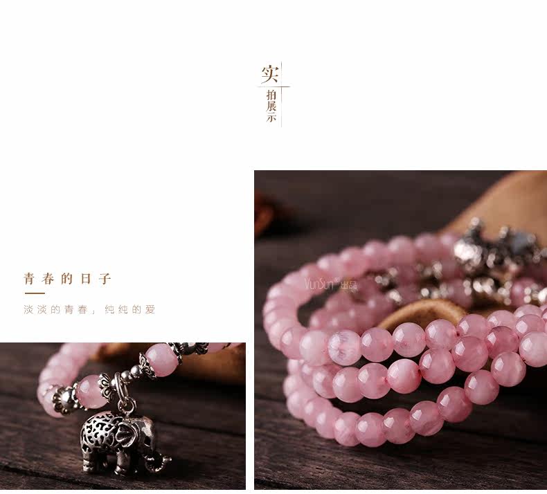 VunSun天然粉水晶手链女粉晶多层多圈可爱饰品小象925银饰手串