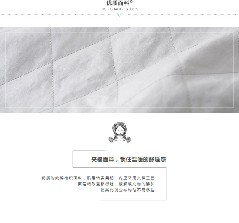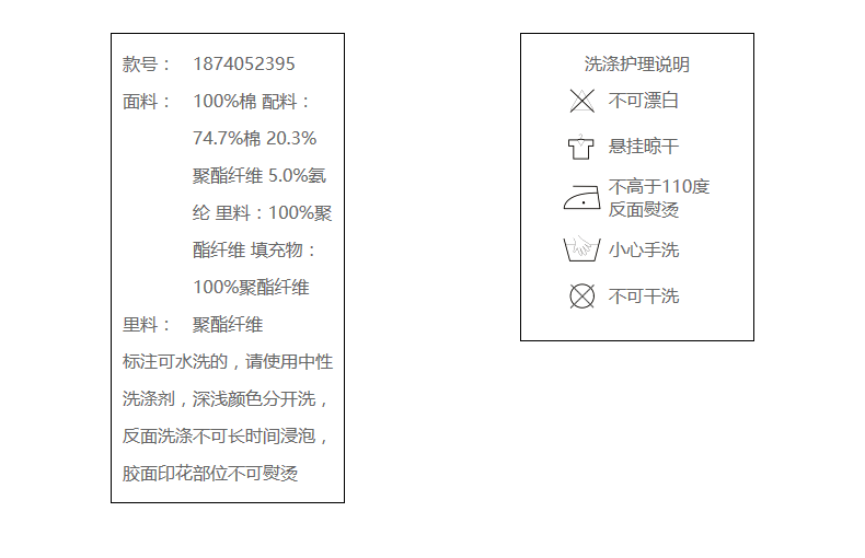 100%棉 配料:74.7%棉 20.3%聚酯纤维 5.0%氨纶 里料:100%聚酯纤维 填充物:100%聚酯纤维