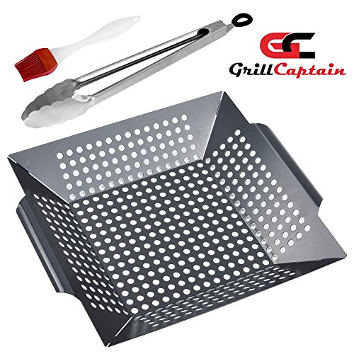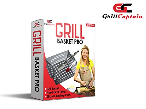 Grill Basket Pro by Grill Captain, Nonstick Grilling Basket for Veggies, Fish, Meat, Perfect for Vegetarians and Vegans! Large Grill Topper is Dishwasher Safe, Free BBQ Tongs and Silicon Basting Brush