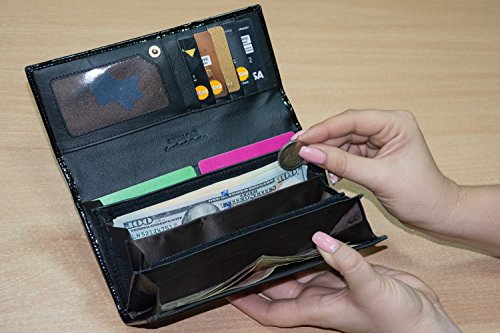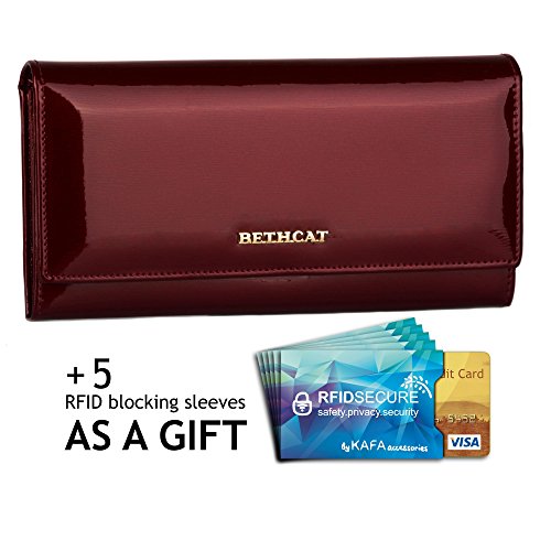 -. Binding : Apparel -. Brand : BETH CAT -. Color : Red -. Department : womens -. Feature : Features: 15-card holder, 4 large bill holders, 1 zippered pocket with two compartments, 1 ID holder. / Material: patent genuine leather. Size: 7.48"L x 3.94"W x 1.18"H. / You get a free set of 5 RFID blocking sleeves. Protect your personal and financial information from data thieves. / Easy and convenient to carry and use. Great gift for girls and ladies. / Used to hold cash, credit cards, ID card and other little things. -. ProductGroup : Apparel -. ProductTypeName : ACCESSORY -. Size : Medium -. Title : Patent Leather Classic Womens Wallet Card Holder Clutch+5 RFID blocking sleeves
