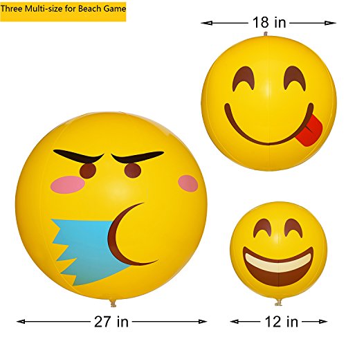 *Bulk Inflatable Balls In 3 Size: Packed with 6 pieces 12’’ inflatable beach balls, 5 pieces 18’’ blow up balls, 1 piece 27’’ emoji sport balls, with 7 different unique emoticons for different taste.
