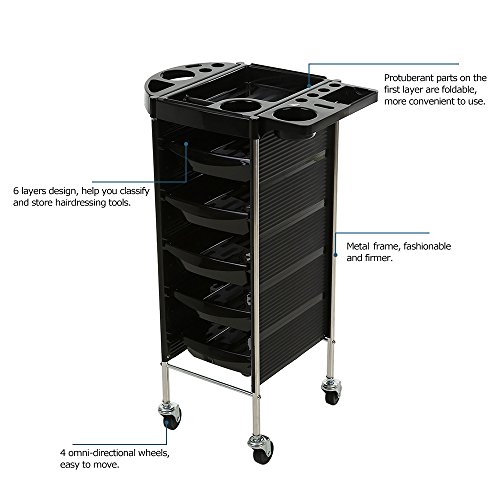 -. Feature : 6 layers design, help you classify and store hairdressing tools. / Protuberant parts on the first layer are foldable, more convenient to use. / 4 omni-directional wheels, easy to move. / Metal frame, fashionable and firmer. / Perfect for beauty salon, hairdressing salon and spa salon.