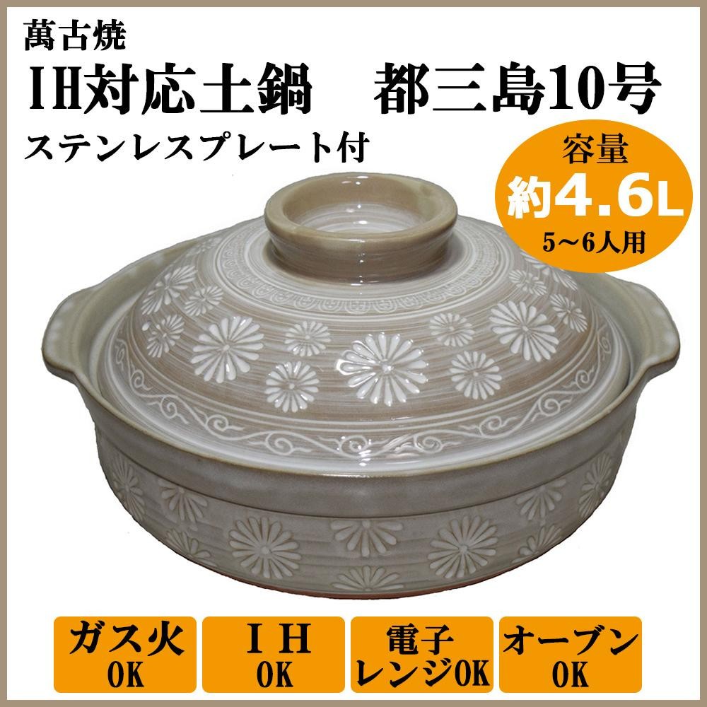 一般的な三島柄土鍋です。底面が平らに加工してあるので、ガス火はもちろんIHでもお使いいただけます。JISマーク取得済みです。 |