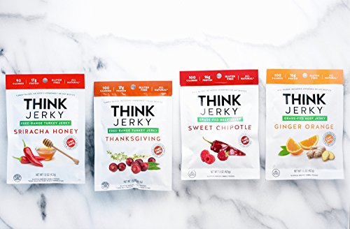 -. Feature : Think Jerky Grass-Fed Beef and Free-Range Turkey Jerky Variety Pack of 4 / Contains 1 (1.5 oz) Bag of Each Featured Flavor / Featured Flavors: Ginger Orange Grass-Fed Beef Jerky, Sweet Chipotle Grass-Fed Beef Jerky, Thanksgiving Free-Range Turkey Jerky, and Sriracha Honey Free-Range Turkey Jerky / Gluten Free, Non-GMO, No Nitrites, All Natural, No Added Hormones or Antibiotics, Paleo Friendly