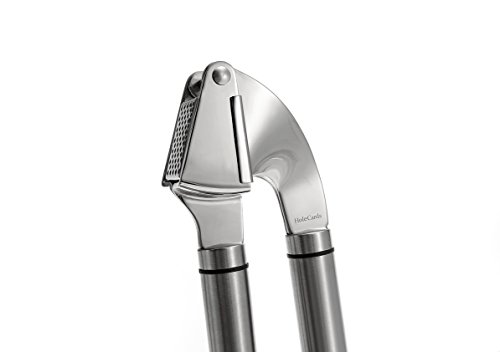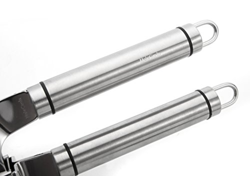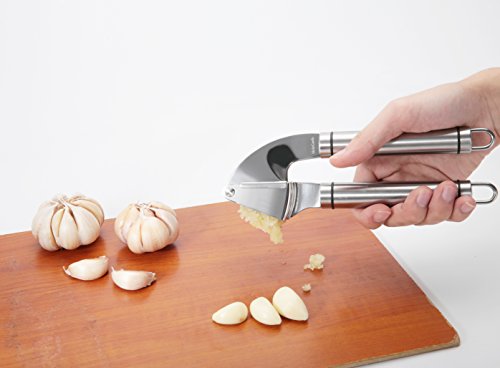 Stainless Steel: Made of sturdy stainless steel, this garlic press features an ergonomic handle for a comfortable grip and a large chamber that fits multiple cloves. It will never rust.