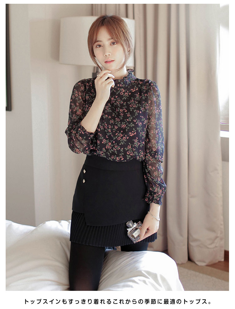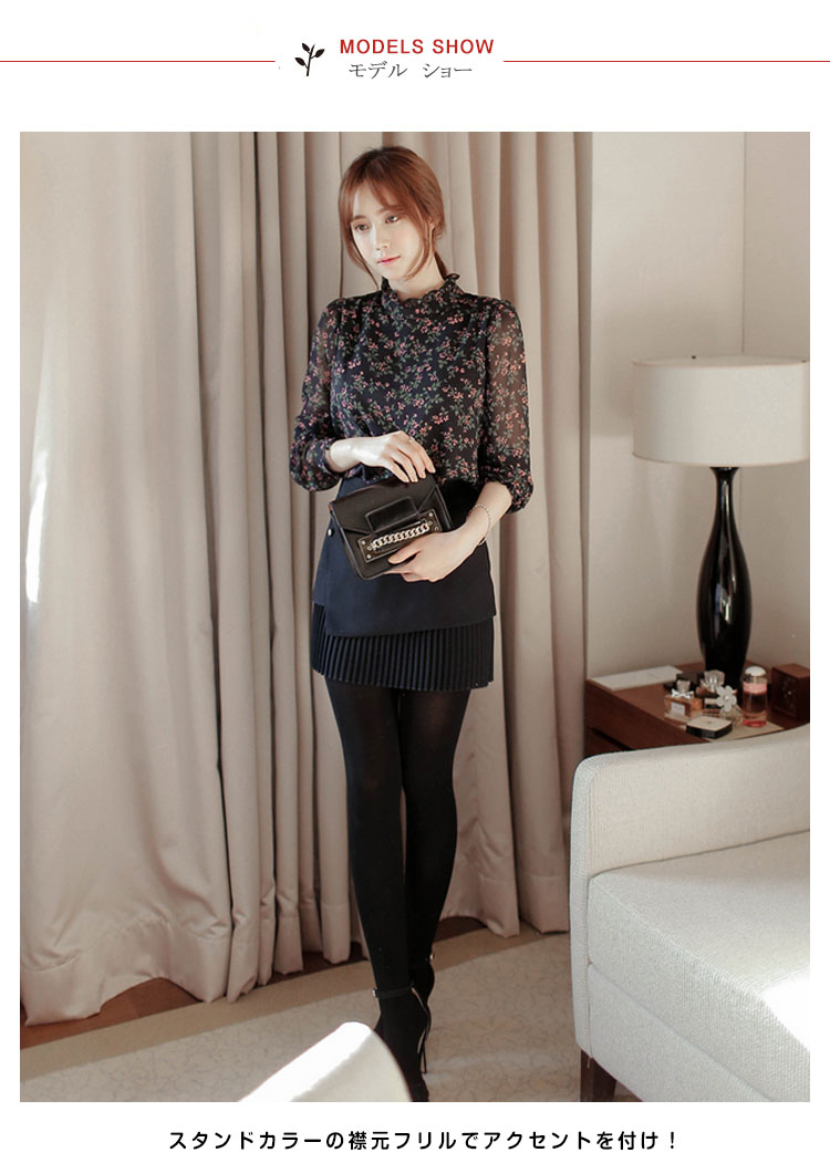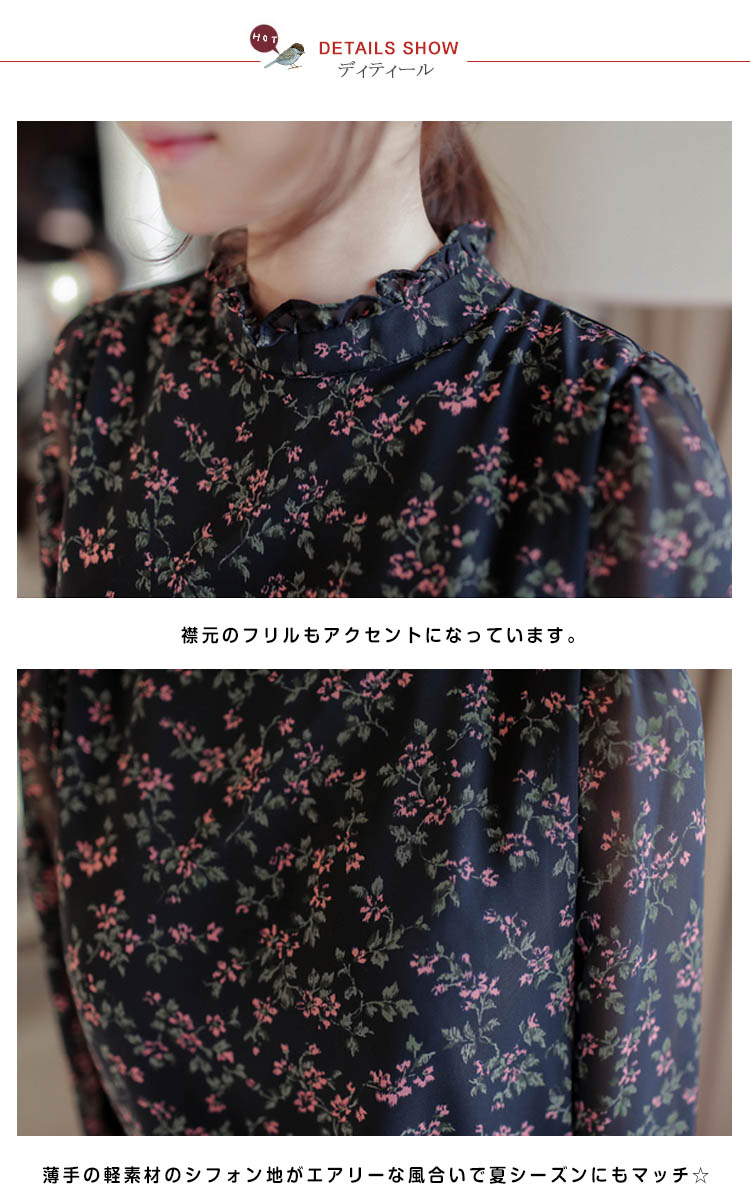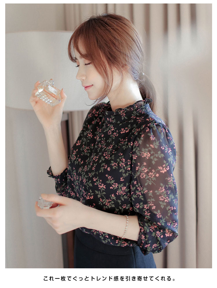 | 可愛い花柄を使いの愛らしさに溢れたブラウス!スタンドカラーの襟元フリルでアクセントを付け!これ一枚でぐっとトレンド感を引き寄せてくれる。さらっとした生地と小花柄が上品な大人マストアイテム。ボトムも選ばず、好みのスタイルが叶います!トップスインもすっきり着れるこれからの季節に最適のトップス。 | |