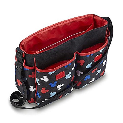 Keep all of your baby's needs at hand with this infant's Mickey Mouse diaper bag set from Disney. This convenient carryall features durable nylon construction and sports a multicolored allover print of Mickey's silhouette, as well as an embroidered applique of the main mouse, himself, on the flap. A generous five-pocket design allows ample space for bottles, toys, diapers, wipes and formula. In addition, this set comes with an attached see-through accessory bag and a fold-out foam changing pad.Feature