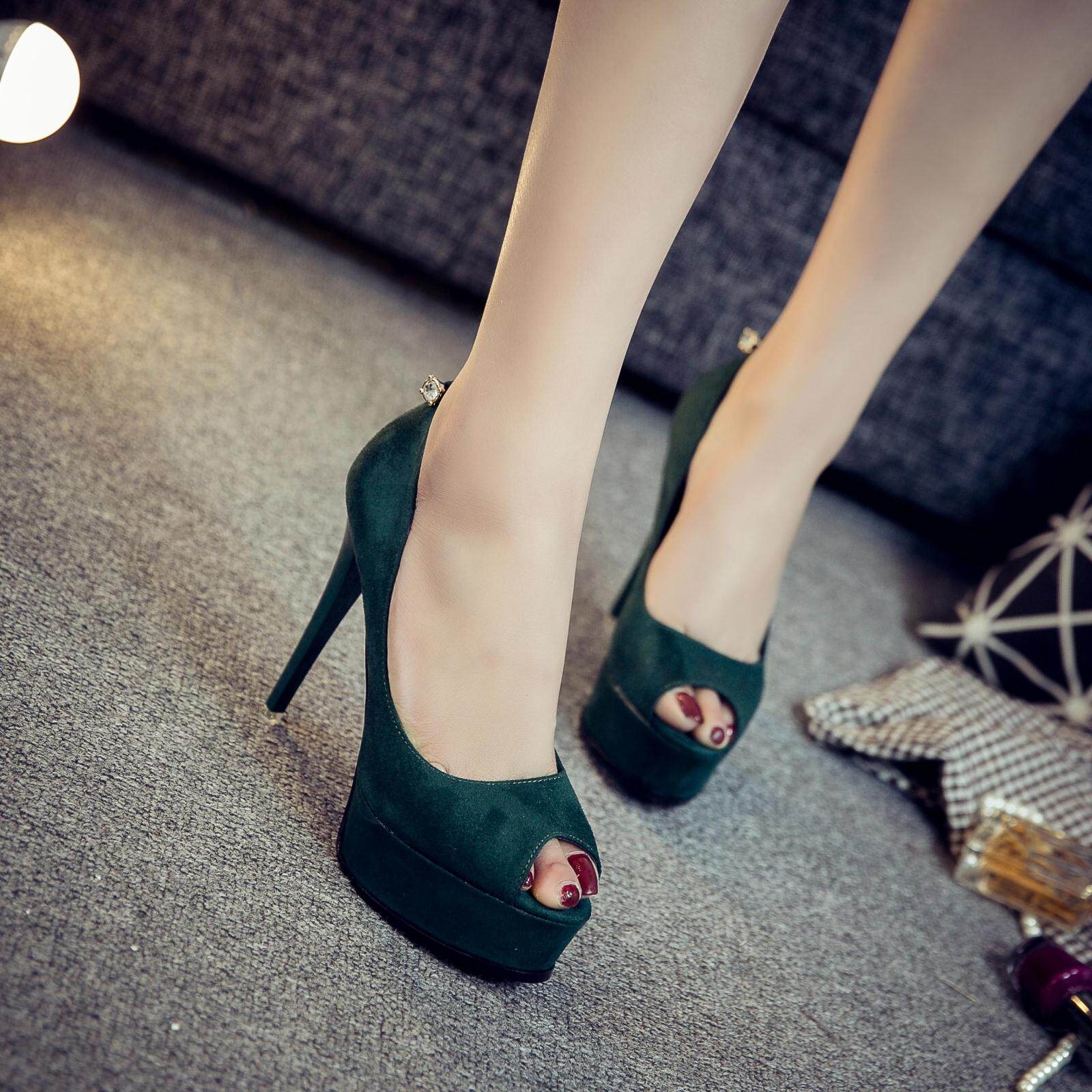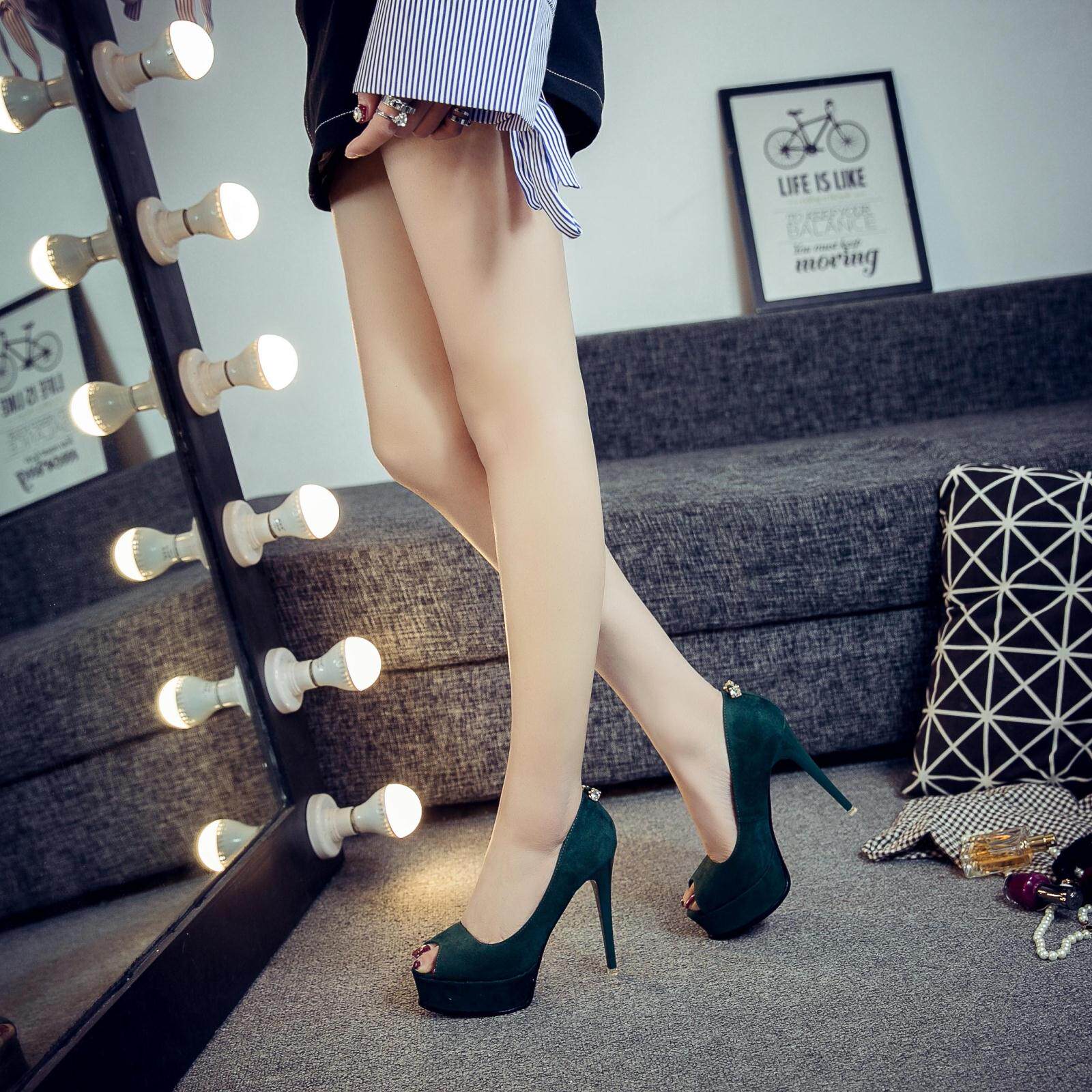时尚绒面超高跟鱼嘴鞋细跟防水台舒适黑色工作鞋单后吊钻女秋