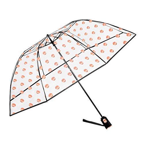 Product Description Everything looks brighter from inside The Bubble ... the clear winner when you want the very best dome bubble umbrella, now available in a new fashion printed compact version! You can see out, but the rain can't get in. With sturdy fiberglass ribs and an electrostatic black steel shaft, nothing protects you - and your hairdo - better than the brand-new Bubble compact see-through umbrella. Transparent 43" arc printed with rose gold polka dot coins and trimmed in contrasting black binding with a matching auto open pushbutton handle. 0