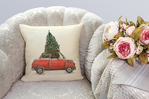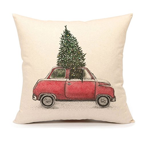 Christmas Tree and Red Car Throw Pillow Cover Home Decorative Cushion Case 18 x 18 Inch Cotton Linen for Sofa(Vintage)
