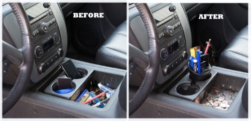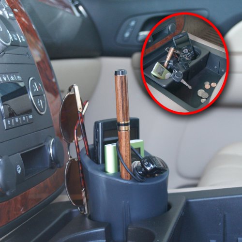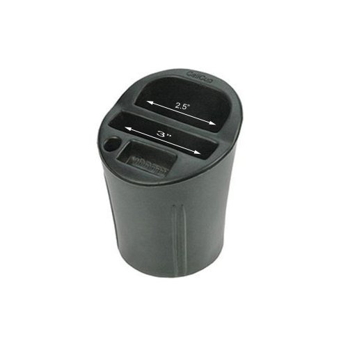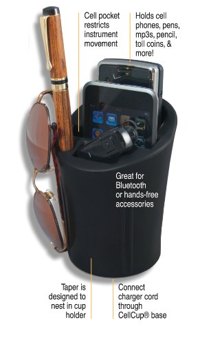 A Cell-Cup is a must for commuters with cell phones. The Cell-Cup easily fits into the cup holder providing a secure location for your cell phone, note pad and pens or pencils. All of this in one handy location. It now holds popular phones such as iPhone, Blackberry and other large smart phones. Also holds your MP3 or iPod. Slots are 1-1/2 inches to 2-1/2 inches deep. The phone compartment even has an opening in the base for connecting phone and iPod charger cords.