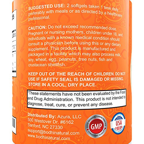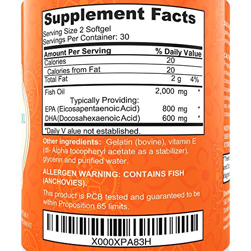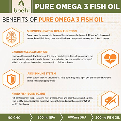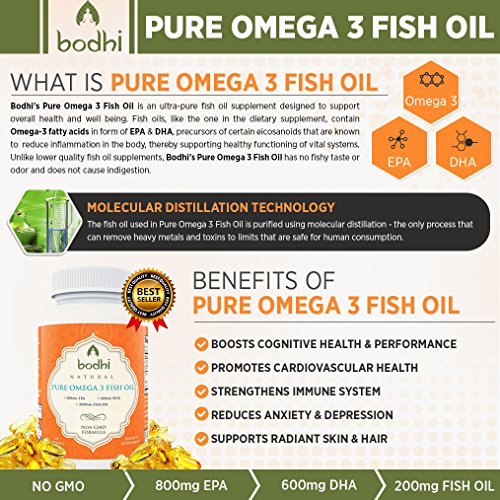 -. Binding : Health and Beauty -. Brand : Bodhi Natural -. EAN : 0738676724363 -. Feature : BETTER ABSORPTION & PREVENTION OF FISHY AFTERTASTE: Our omega 3 fish oil pills have an enteric coating to increase your absorption of the essential fatty acids and to prevent fishy aftertaste. Enjoy Health Benefits Without Fish Burps! / PURITY THROUGH MOLECULAR DISTILLATION: Pure Omega 3 Fish Oill is purified with molecular distillation - one of the few current methods that can remove heavy metals, PCB's and other toxins to below detectable limits for human consumption. / 2,000 mg Fish Oil with 1,400 mg Omega-3 Fatty Acids (600 mg DHA, 800 mg EPA) per serving (2 caps)! Get 3-4 times more of the important Omega-3s compared to many other brands. With this product, you will meet the tried-and-true recommendation of 600 mg DHA per day - with a single serving! Fish oil supports the cardiovascular system, brain health, joints, mood & mental state, in addition to radiant skin & hair. / Made in the USA - All our products our made in FDA approved facilities inthe USA under the strictest GMP guidelines. Buy with confidence knowing the quality of our Pure Omega 3 Fish Oil is guaranteed. / What are you waiting for? Pure Omega 3 Fish Oil is the perfect supplement for your body. Everyday that goes by without taking this supplement is another missed opportunity to experience your life with your body firing on all cylinders. -. IsAdultProduct : 0 -. Label : Bodhi -. LegalDisclaimer : We are not associated with Dr. OZ or the Doctor show. -. Manufacturer : Bodhi -. ProductGroup : Health and Beauty -. ProductTypeName : HEALTH_PERSONAL_CARE -. Publisher : Bodhi -. Studio : Bodhi -. Title : Powerful Omega 3 Fish Oil Supplement: 2000mg Fish Oil, (800mg EPA, 600mg DHA) Per Serving. Non GMO Formula. No Fishy Aftertaste. Perfect Source of Fatty Acids. 60 Softgels. -. UPC : 738676724363