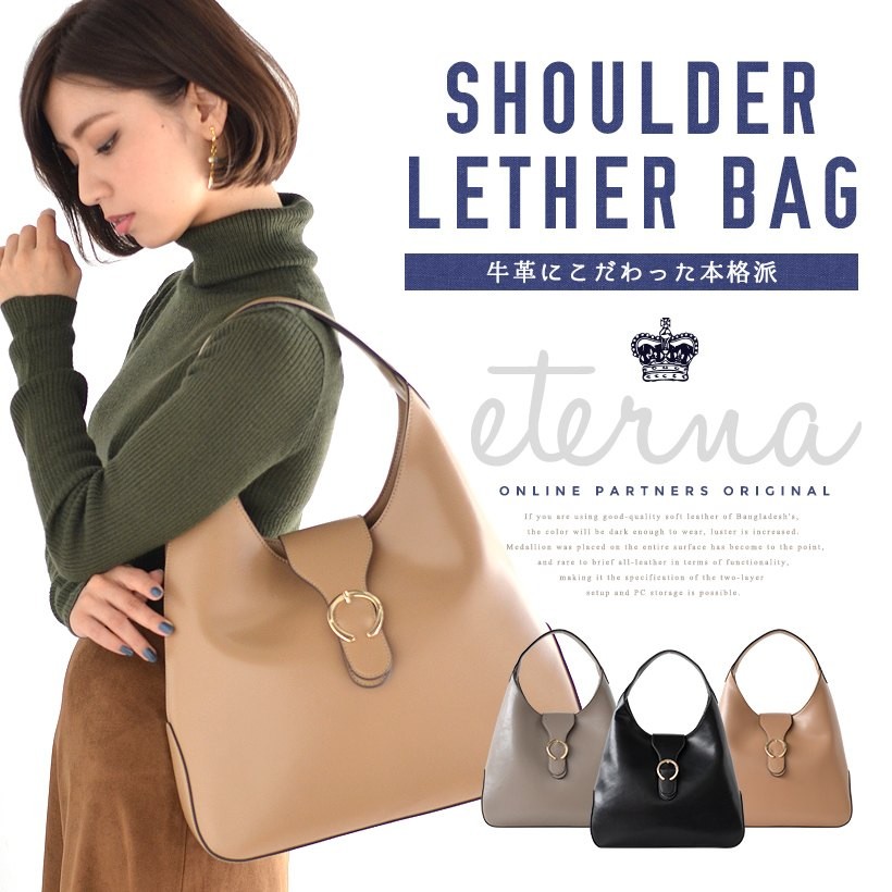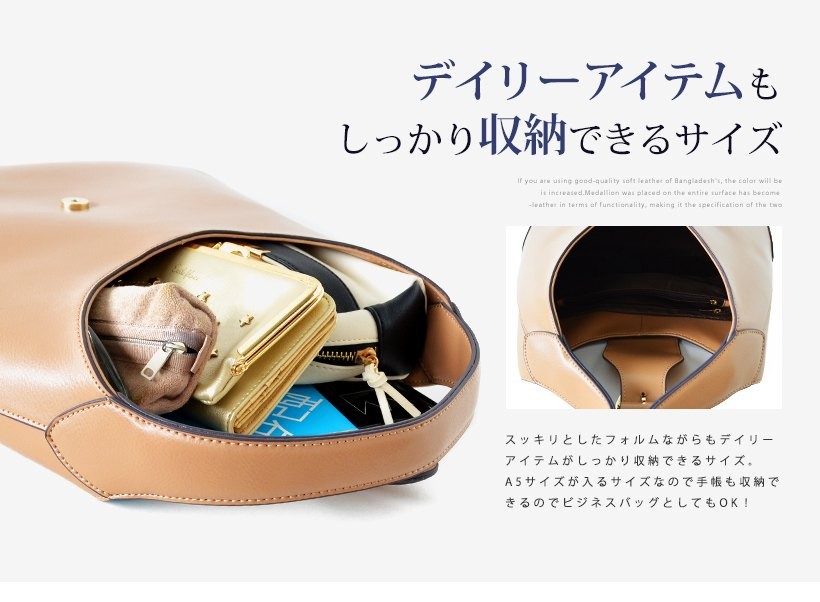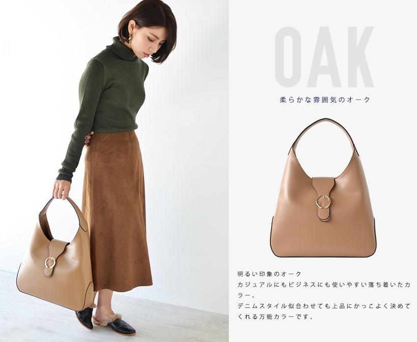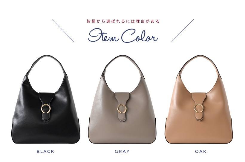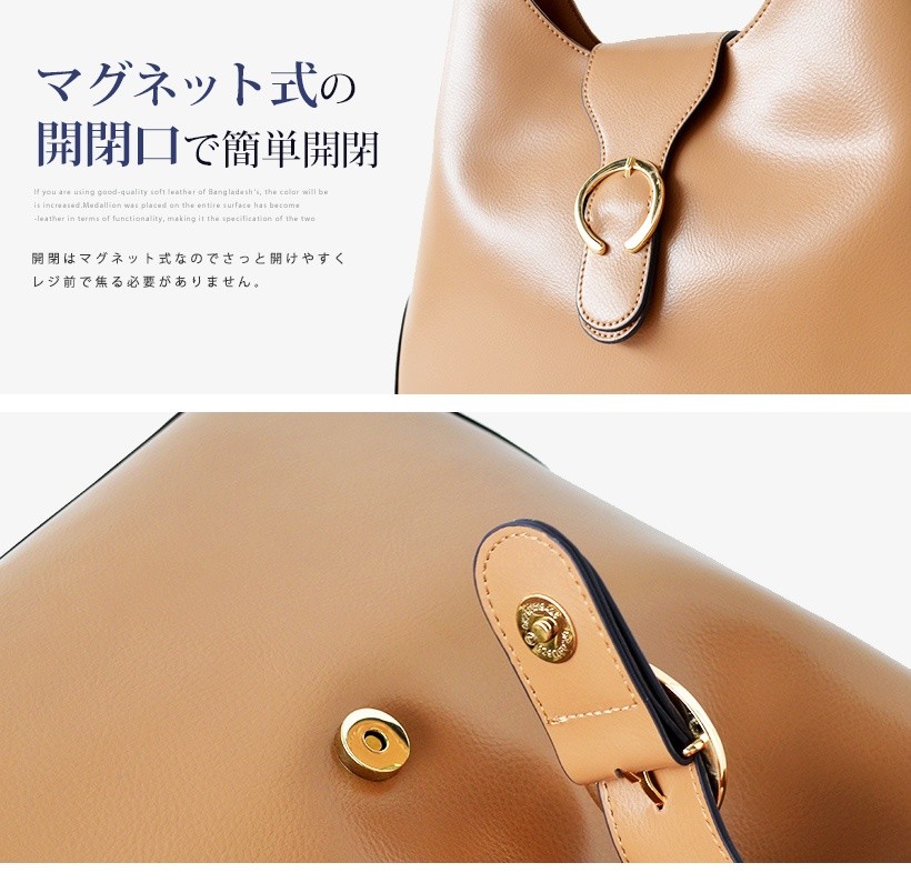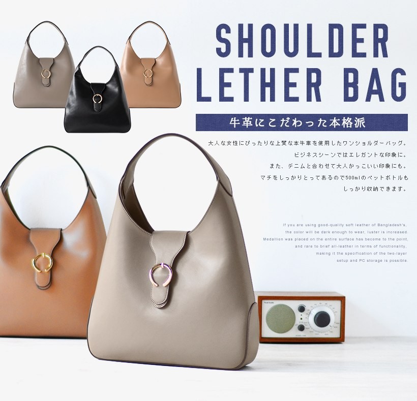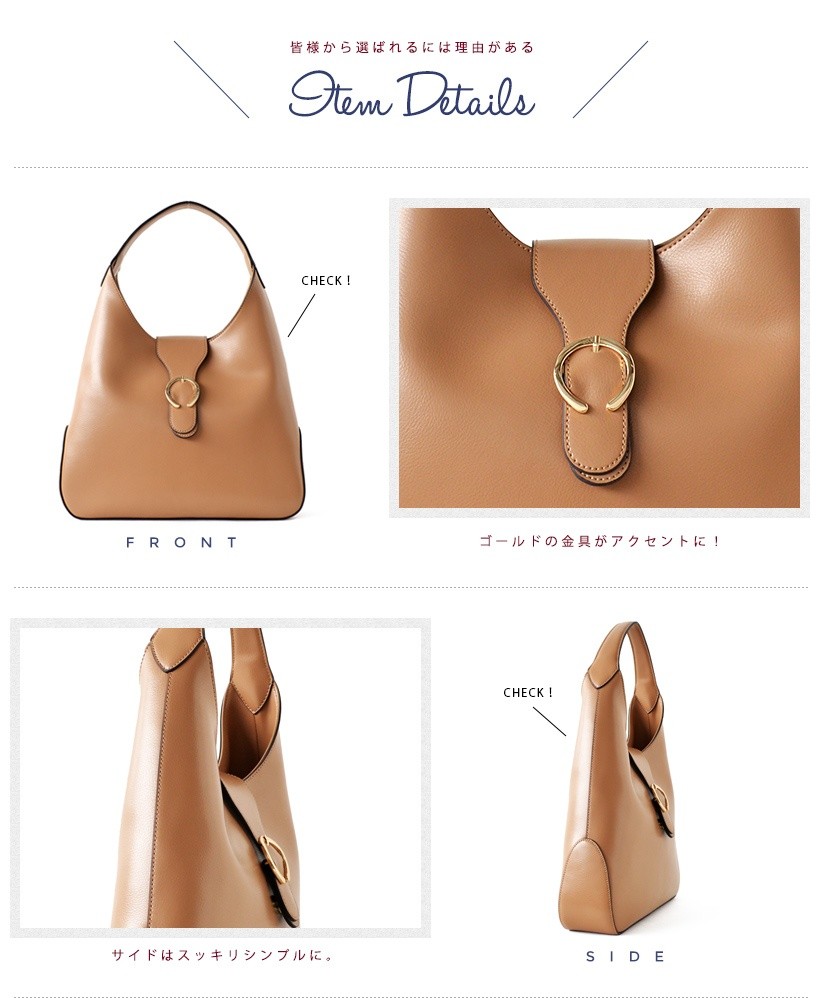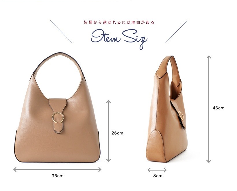 上品なワンショルダーバッグ肩にさっとかけやすいワンショルダー。フロントのゴールドの金具がポイント!シンプルだけど、しっかりアクセントに。●SIZE:幅最大:約36cm / 高さ:約26cm / マチ:約8cm●ハンドル長さ:約30cm×幅:約2.7cm、持ち手高さ:約20cm●外ポケット:なし●内ポケット:オープンポケット3、ジッパー付きポケット2●重さ:約620g●素材:牛革●バッグのメイン開閉口はマグネットになっております。