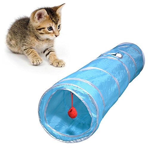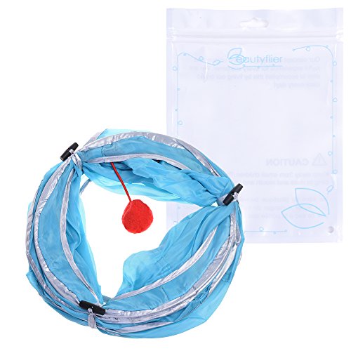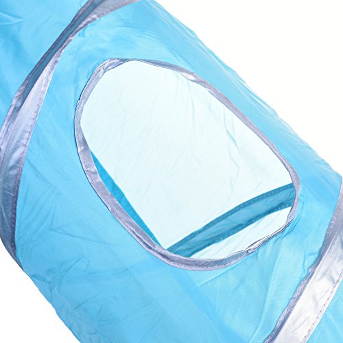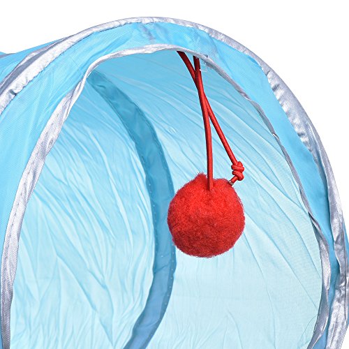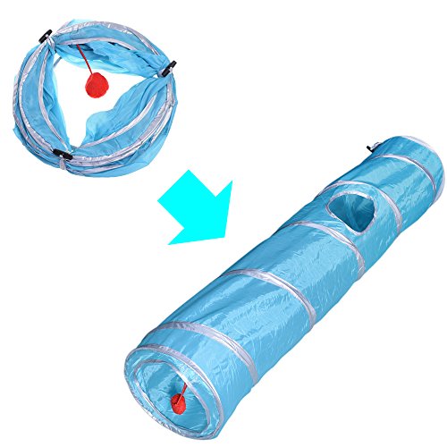 2 Way cat tunnel blue polyester with crackle paper and silver stripes, sturdy steel sprung frame surrounded make it stand stably and be easily folded up and down to take up your minimal space The Peep Hole and Hanging Ball Toy offer fun for pets and hours of amusement, inspire cat's instincts and appeal cat to hide, stalk, and chase with each other in it The tunnel can be fold with an elastic band for easy storage, strong and solid sprung steel frame with protective ends, save space, easy to store and carry whether you travel or at home Size: 47 inch x 9.4 inch (L x W), middle hole diameter: 7 inches, entrance opening diameter approx. 8 inches Suitable for small cats, dogs or bunnies, It's easy to be stretched and pulled back on the floor regardless of outdoor or indoor activities, even stored in backpack, storage box to save a lot of space, flexibly moved around to fit any room 0 |