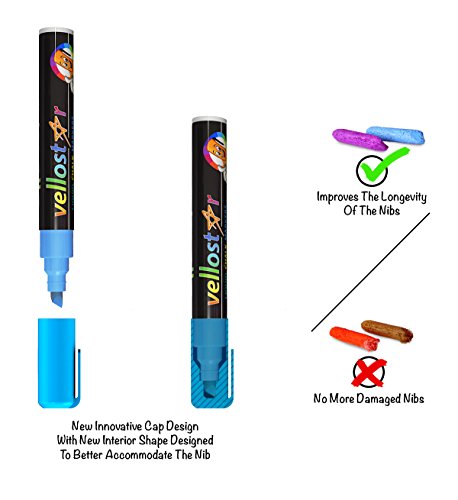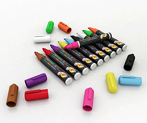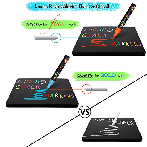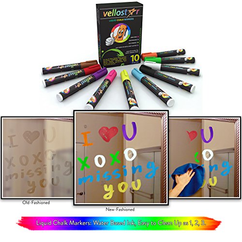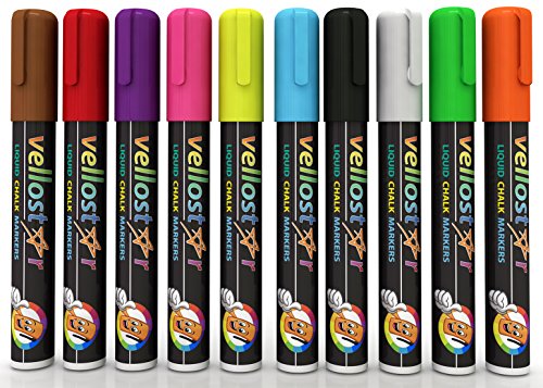 Vellostar Liquid Chalk pens is an 10-pack of neon color ready to create whatever fun, eye-catching design you want. The 6mm reversible tips give you the control and versatility you need to create anything. Our neon chalk markers work on all non-porous surfaces, dry quickly and clean off with a damp cloth. Our high- quality inks are water-based, acid-free, odorless and won't bleed, clog or smear. And we promise the colors are so vibrant you'll need to wear your shades. Our chalk pens:Love them or your money back