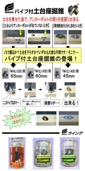 基礎(コンクリート)と土台を固定するときに、アンカーホ゛ルトが土台より出ていない場合、アンカーホ゛ルトを傷めずに簡単に座掘りができます。 製造国:日本 素材・材質:炭素鋼S55C 仕様:座掘径:60mmアンカーホ゛ルト12mm(4分)用土台ホ゛ルト穴15mm以上 ※サプライヤー直送品 ご注文後2~3営業日後の出荷となります【商品名】ウイング パイプ付土台座掘錐アンカーボルト12mm(4分)用 60mm