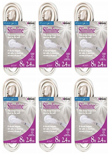 6-PACK - SlimLine 2241 Flat Plug Extension Cord, 3-Wire, White, 8-Foot