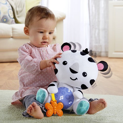 It's time to dance! Baby can play and clap along as the tiger's head rocks back and forth to four sung songs and cute giggle sounds. Includes a playful bumblebee friend. Requires 3 AA batteries.