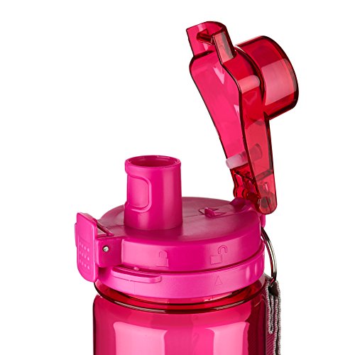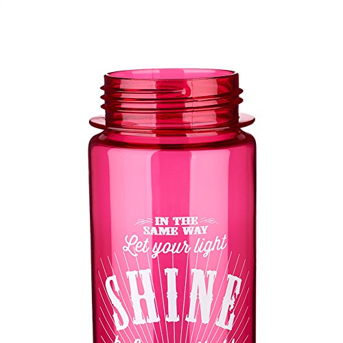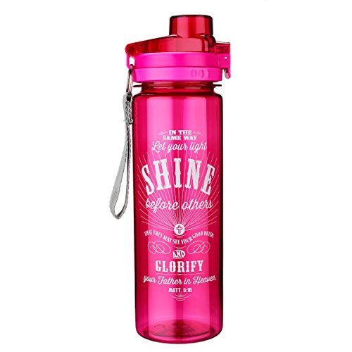 The "Let Your Light Shine" Pink Plastic Water Bottle has a 25 ounce capacity, a webbed loop for carrying and a plastic push-button, flip-top lid with a locking mechanism - simply rotate the ring to lock / unlock. The entire lid can be removed for washing. The bottle design features stylized text from Matthew 5:16 in contrasting white.Feature