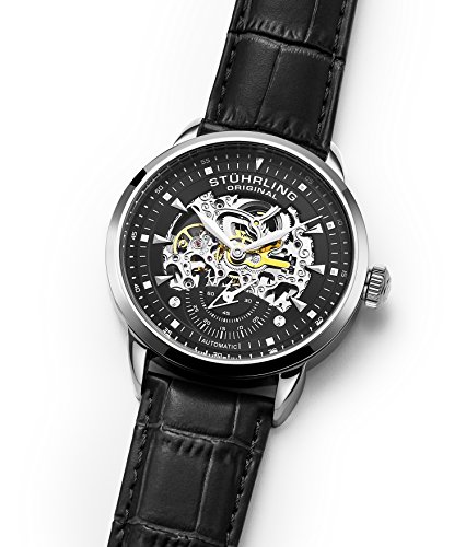 Round watch with black skeleton dial featuring silver markers and seconds subdial at 6 o'clock