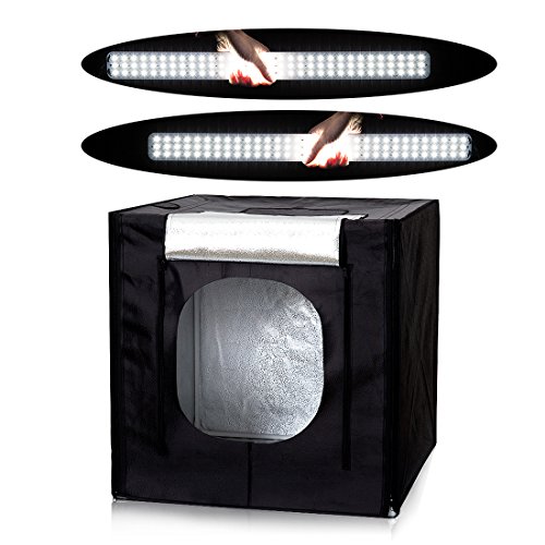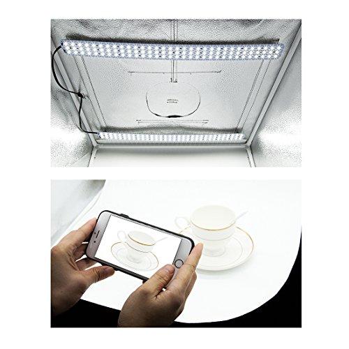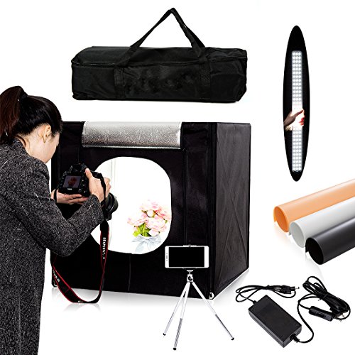 Features: Contents: Contains 1x 39" light tent, 1x white diffuser, 3x backdrops [black, white, yellow], 1x power adapter, 1x Phone Tripod Ideal For Product Photography: Soft, wrap-around lighting is great for photographing small-to-medium-sized items Modular: Adjustable front opening accomodates larger products, and included backdrops cover various styles Safe and Energy-Efficient: LEDs feature ultra-low heat output and energy usage Portable: Cube is collapsable, able to be folded completely for easy transportation