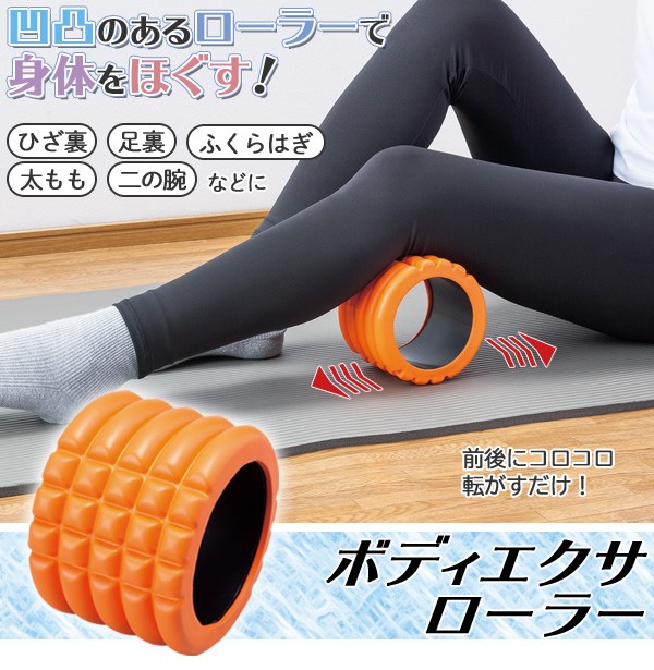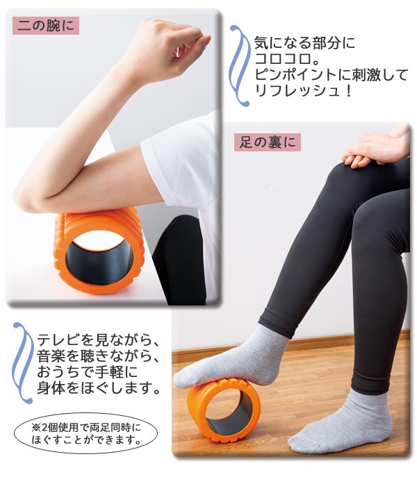 | テレビを見ながら、音楽を聴きながら、おうちで手軽に身体をほぐす!弾力性のあるEVA素材の凸凹で心地よく刺激する、ボディエクサローラーです。ひざ裏・足の裏・ふくらはぎ・太もも・二の腕など、気になる部分にコロコロ転がし、ピンポイントに刺激してリフレッシュ!2個使用で両足同時にほぐすこともできます。小さめ・軽量なのでサッと持ち運べて、保管も場所をとりません。 |