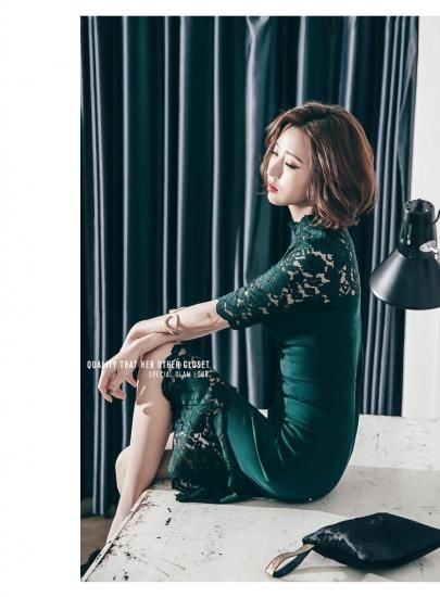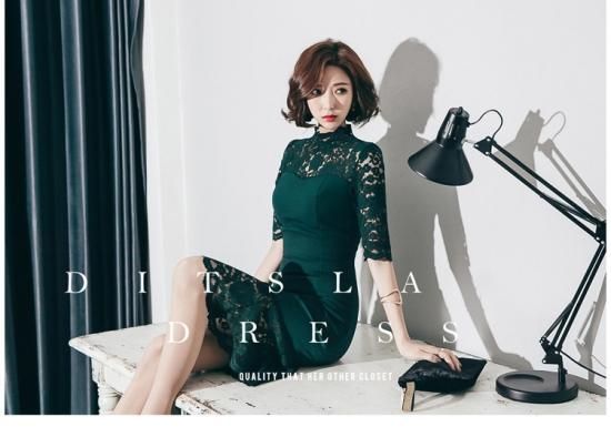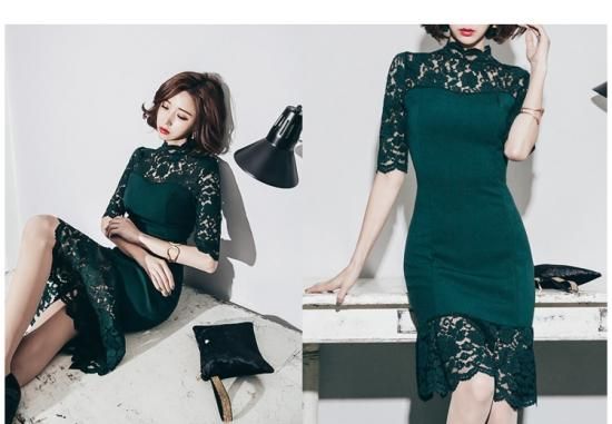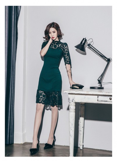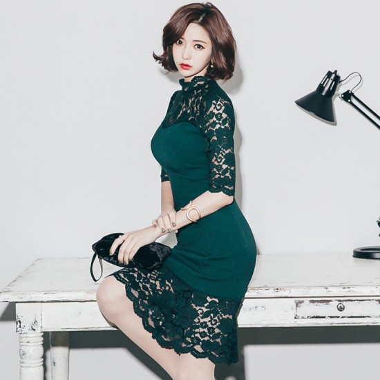 ワンピース 膝上丈 ドレス レース 二次会 パーティー 華やか 可愛い 優雅 タイト 五分袖 ハイネック drgz1406