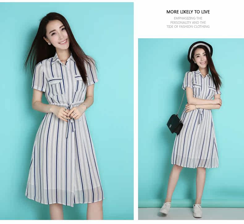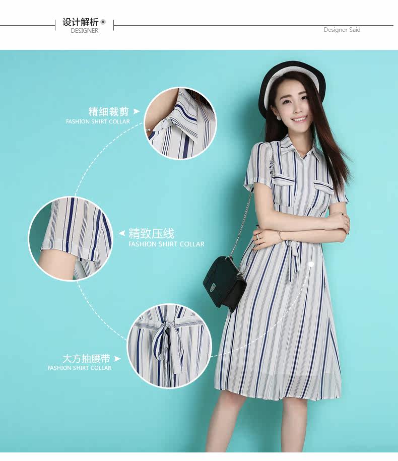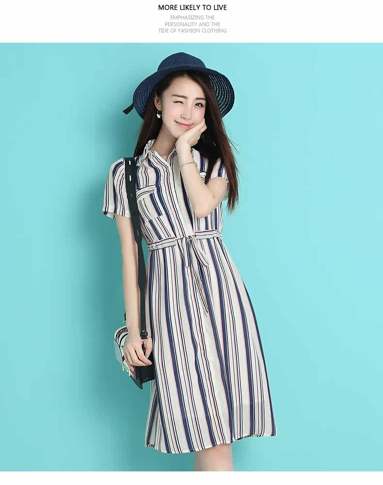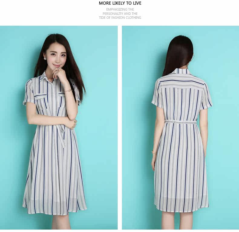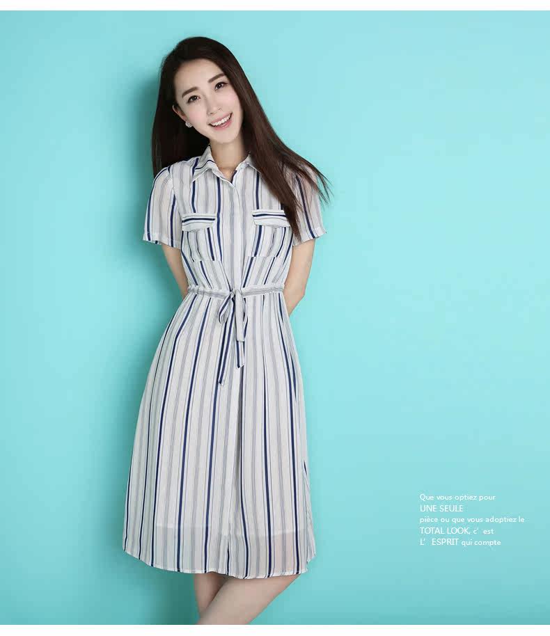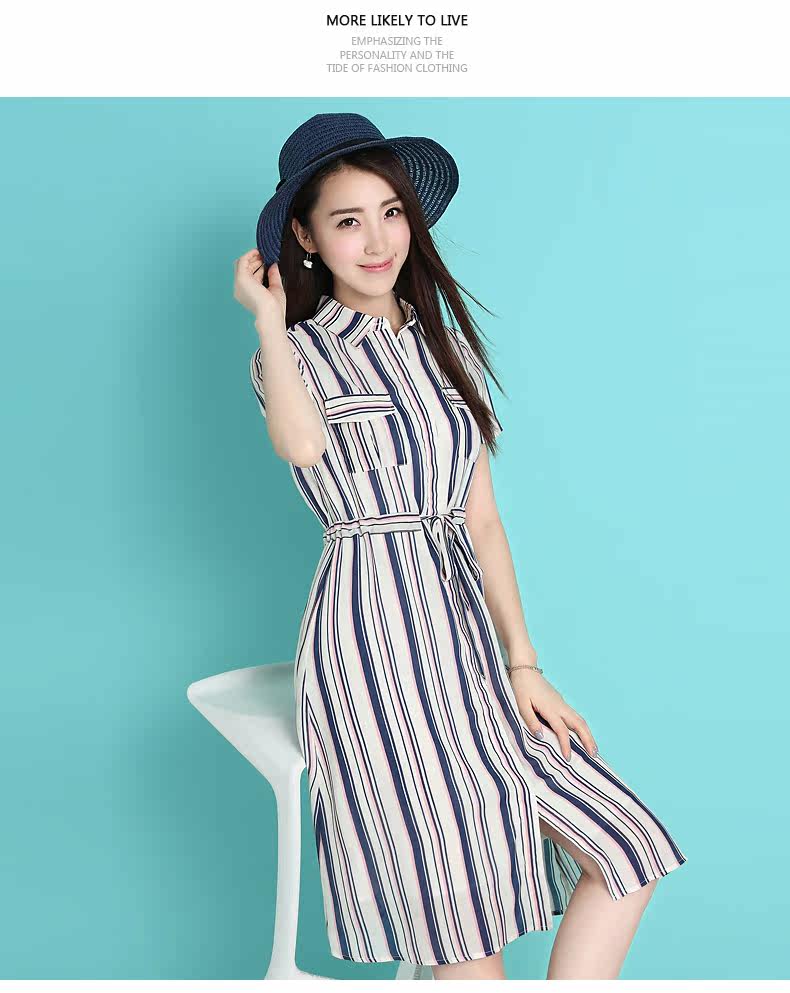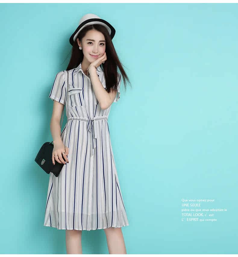 短袖拼色竖条纹衬衫裙夏韩范新品收腰显瘦雪纺中长款连衣裙