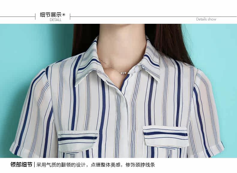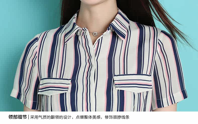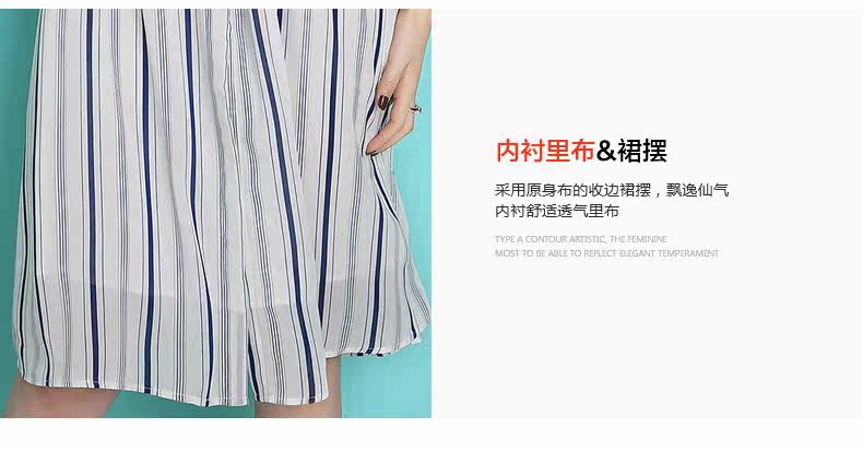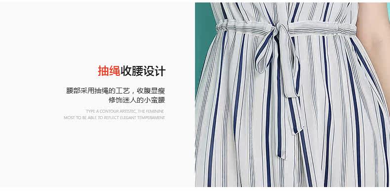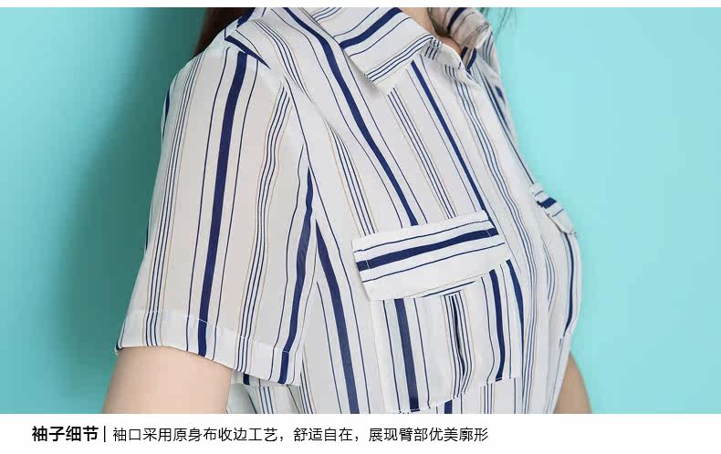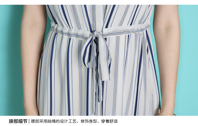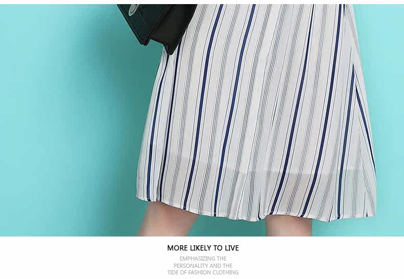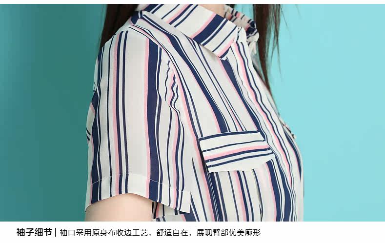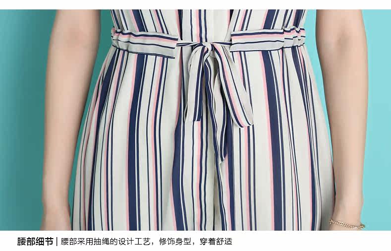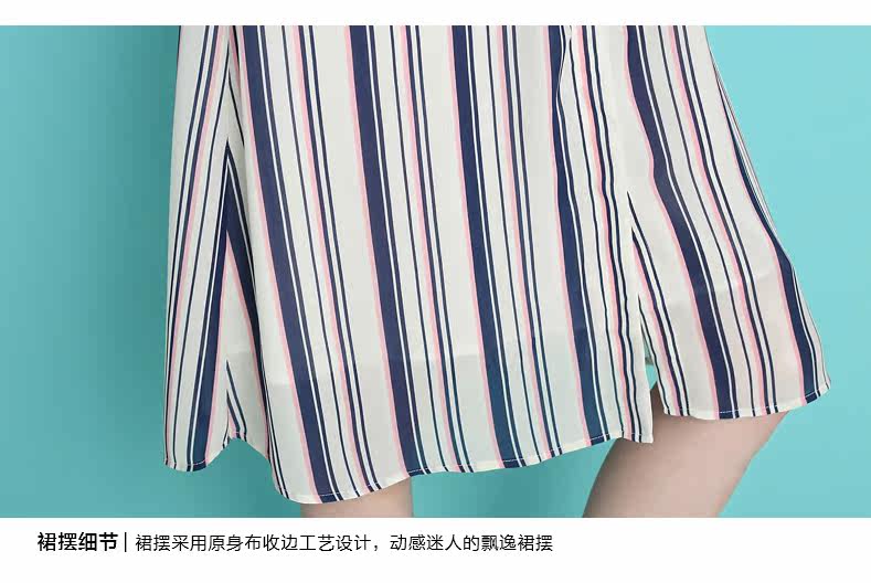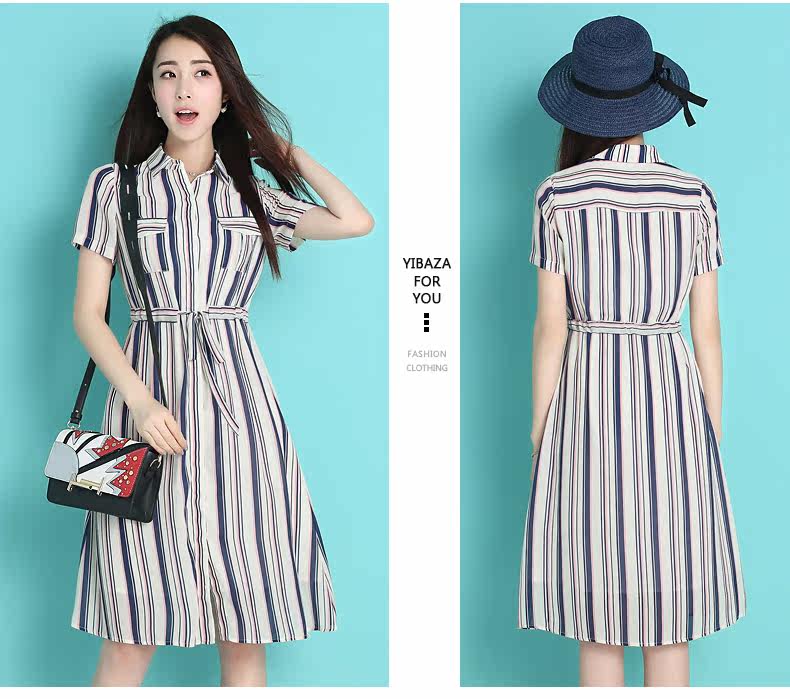 短袖拼色竖条纹衬衫裙夏韩范新品收腰显瘦雪纺中长款连衣裙