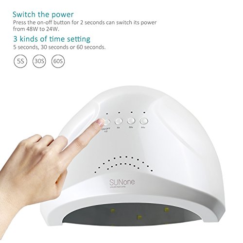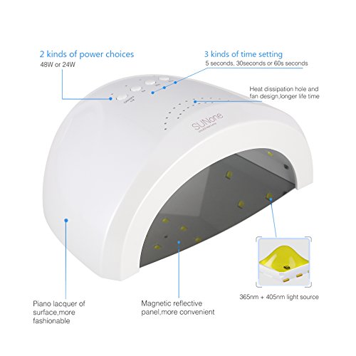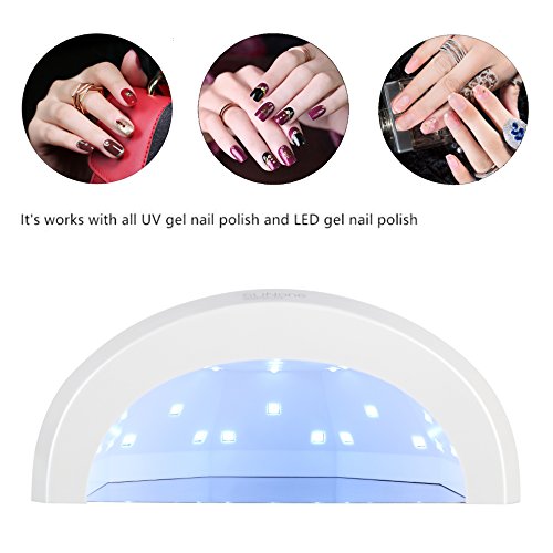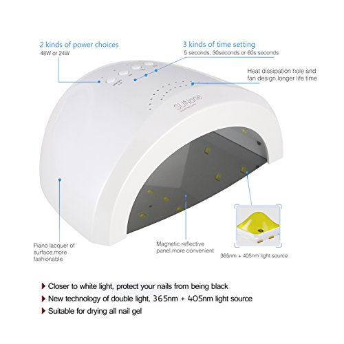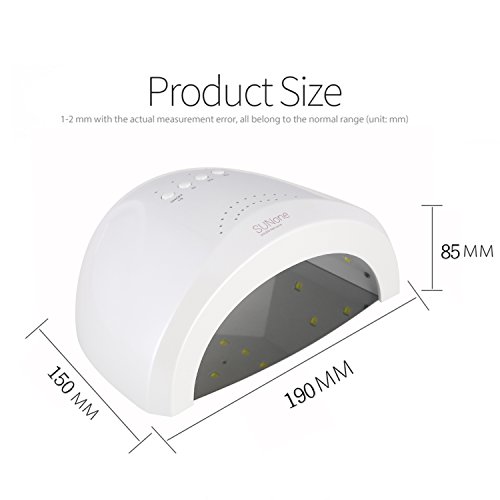 Description: ? This product is a professional nail polish dryer, providing you a salon level nursing for not only your finger nail, but also your toenail. Different from traditional UV nail lamp, it is closer to white light, which ensures the corlor of nail gel. Its light has no harm to nails, eyes and your skin, protecting your hands from being black. ? New technology of double light source covers a wider range of ultraviolet band, suitable for drying nail UV-glue, builder gule, nail polish gel, sculpture gel, gem glue and LED nail gel. No need to worry about distinguishing your nail gel. ? 3 kinds of time setting: 5 seconds, 30 seconds or 60 seconds. It can be started automatically by infrared induction if you put your hand into the machine without pressing time setting button. Its maximum working time is 120 seconds and fastest drying time is 5 seconds. ? Magnetic reflective panel can be separated without tools, more convenient for toenail gel curing. Item specifics: ◆ Brand Name:Ementy ◆ Item Type: Nail Dryer ◆ Plugs Type: EU plug,US plug ◆ Type: UV Lamps ◆ Weight: 640G ◆ Material: ABS ◆ Voltage: 100 - 240V 50 / 60Hz 1A ◆ Size: 15*19*8.5cm ◆ Power: 48W ◆ Model Number: E-1 ◆ Timer: 5s/30s/60s ◆ Safety: No harm to your skin ◆ Color: White ◆ Power: Can Switch Between 24/48W Package List: ?? SUNone Nail Lamp ?? Adapter(US? or EU plug) ?? English Manual Notice: ??? Please read the user manual carefully before use. ??? To keep a long lifetime, please do not keep the LEDs turned on for more than 600 seconds. 0 |