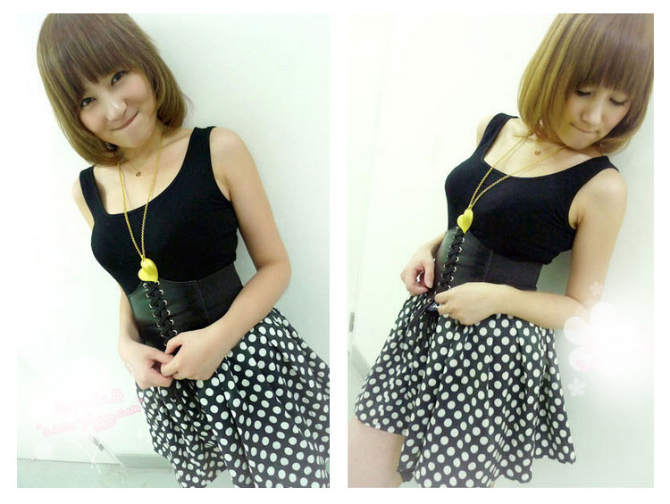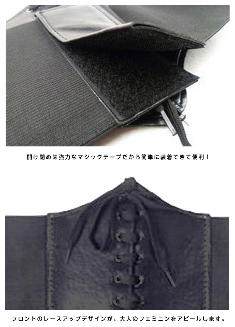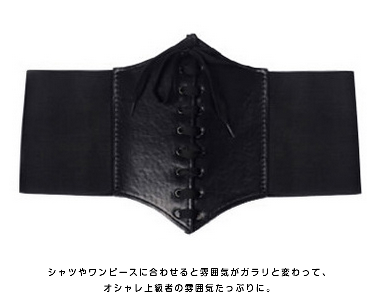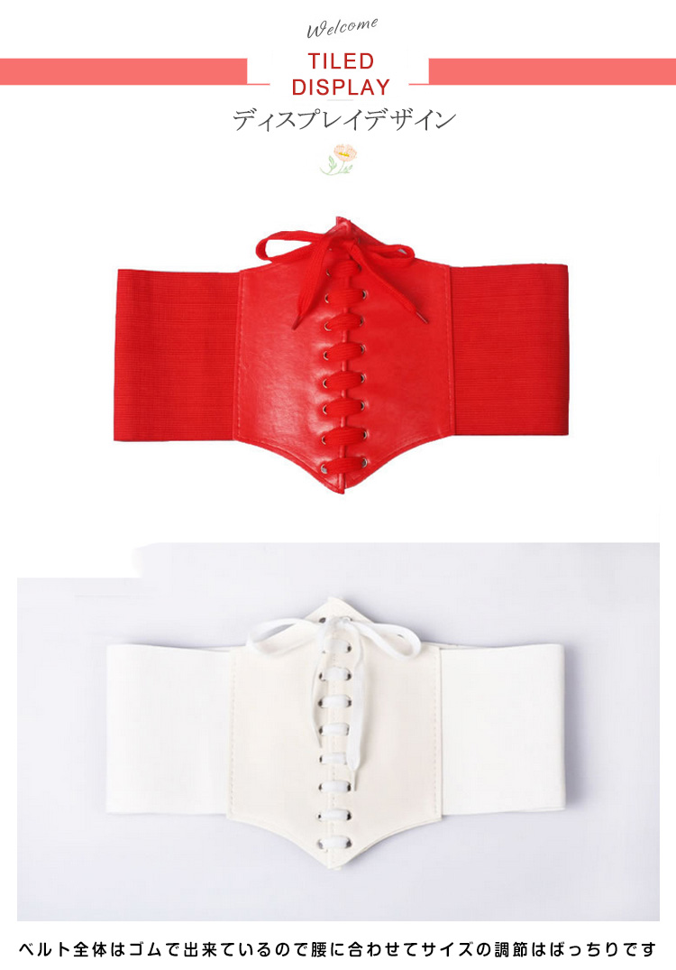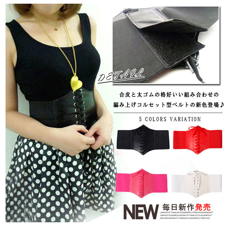 | 合皮と太ゴムの格好いい組み合わせの編み上げコルセット型ベルトの新色登場♪開け閉めは強力なマジックテープだから簡単に装着できて便利!ベルト全体はゴムで出来ているので腰に合わせてサイズの調節はばっちりです。ワンピースの上から着ければ美ライン効果もゲット!! | |