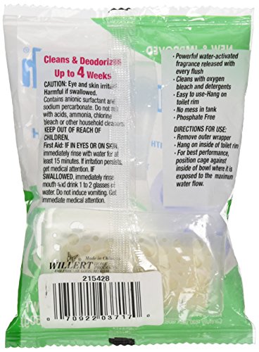 -. Feature : Powerful water activated fragrance that freshens the bathroom with every Flush / NEW & improved cage design allows for more directed water flow / Compact hanger with complete coverage wrapper / Made with natural PP plastic to blend better in toilet environment / Cleans with oxygen bleach & detergents
