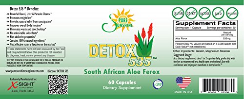 -. Binding : Health and Beauty -. Brand : Pure Sunshine Supplements -. EAN : 0760488025697 -. Feature : Provides Natural Relief from Constipation / Powerful Bowel, Liver & Parasite Cleanse / Eliminates Waste & Toxic Buildup / Natural Detoxing Agent | Improves Overall Body Function / No Undesirable Side Effects | Non Addictive Properties -. IsAdultProduct : 0 -. Label : X-Sight -. LegalDisclaimer : These statements have not been evaluated by the Food and Drug Administration. This product is not intended to diagnose, treat, cure or prevent any disease. -. Manufacturer : X-Sight -. PackageQuantity : 60 -. ProductGroup : Health and Beauty -. ProductTypeName : HEALTH_PERSONAL_CARE -. Publisher : X-Sight -. Studio : X-Sight -. Title : DETOX 535 | South African Cape Aloe Ferox Cleanse |Constipation Pills | Promotes Weight Loss|Most Effective Natural Laxative on the Market |535mg Capsules -. UPC : 760488025697