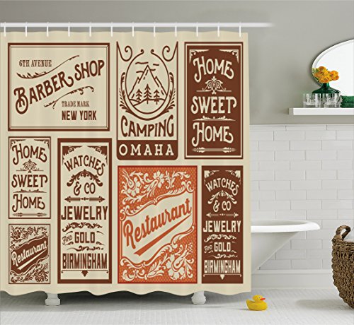 Old Newspaper Decor Shower Curtain by Ambesonne, Advertisement Signs Barber Shop Restaurant Camping Jewelry Home, Fabric Bathroom Decor Set with Hooks, 70 Inches, Brown Orange Tan