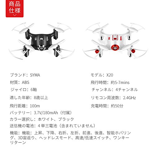 원본상품명: SYMA X20ミニドロン 2.4GHz 4CH 6軸ジャイロ マルチコプタ 3D宙返り ワンキリタン ヘッドレスモド機能搭載ホワイト [行輸入品]
