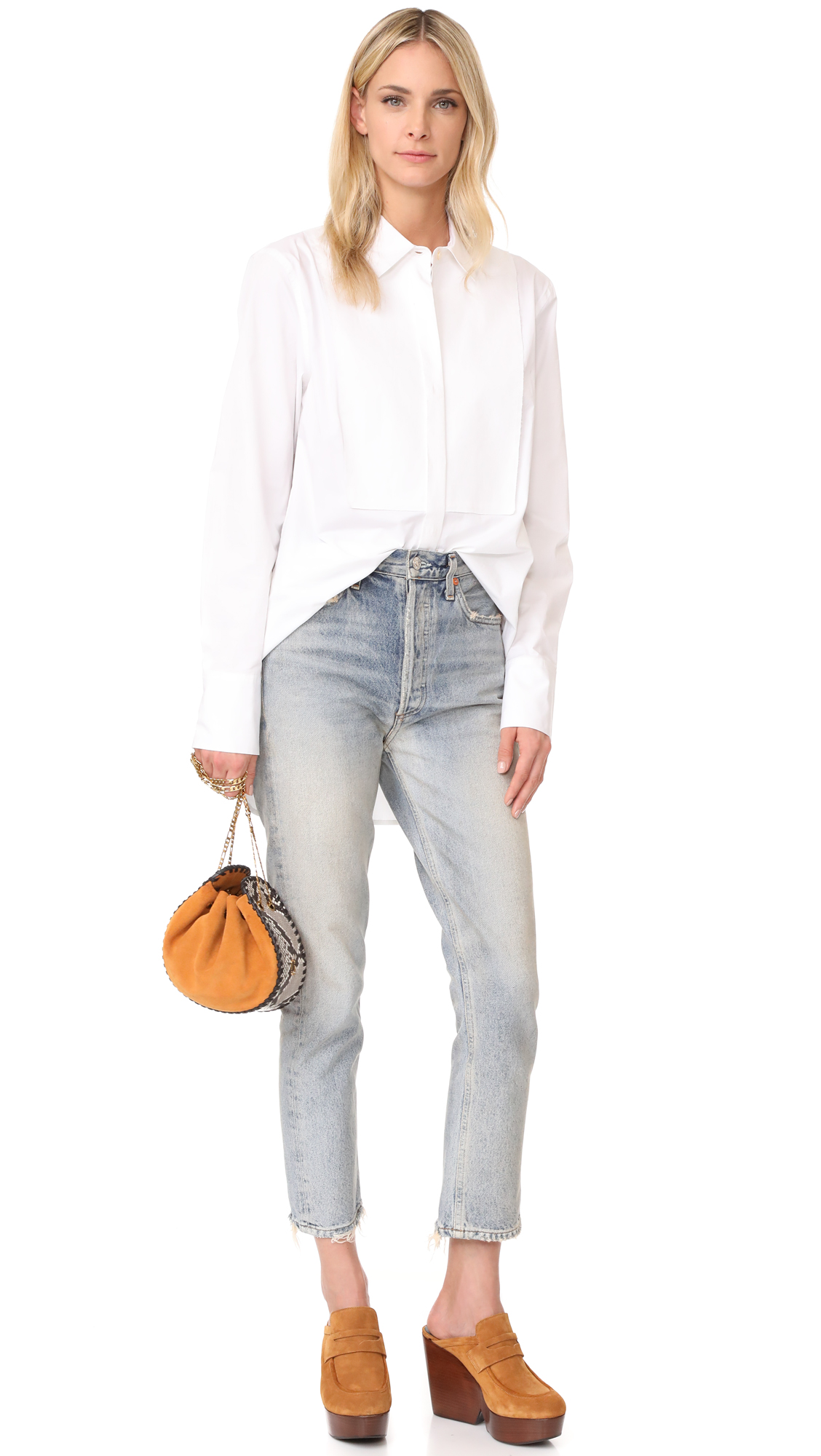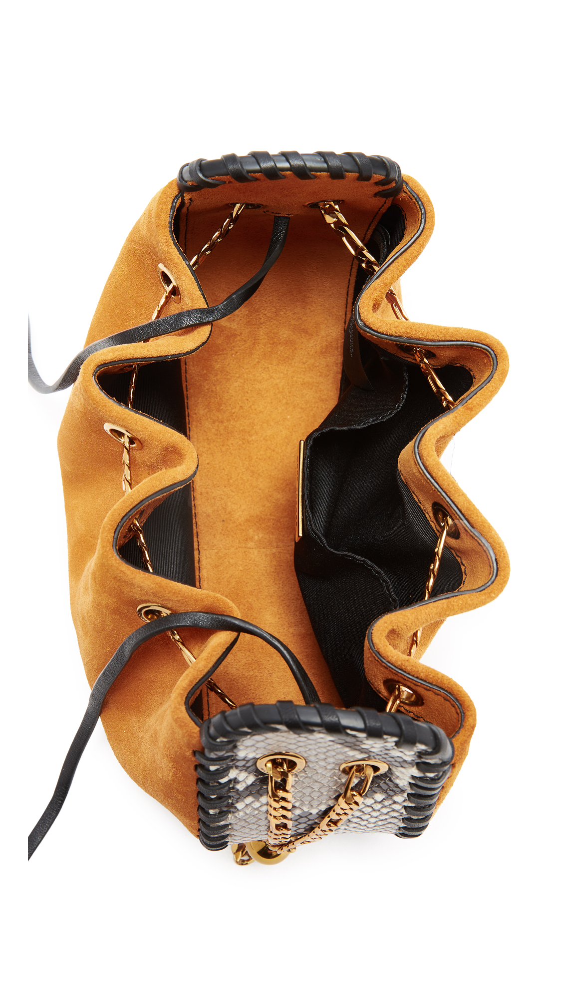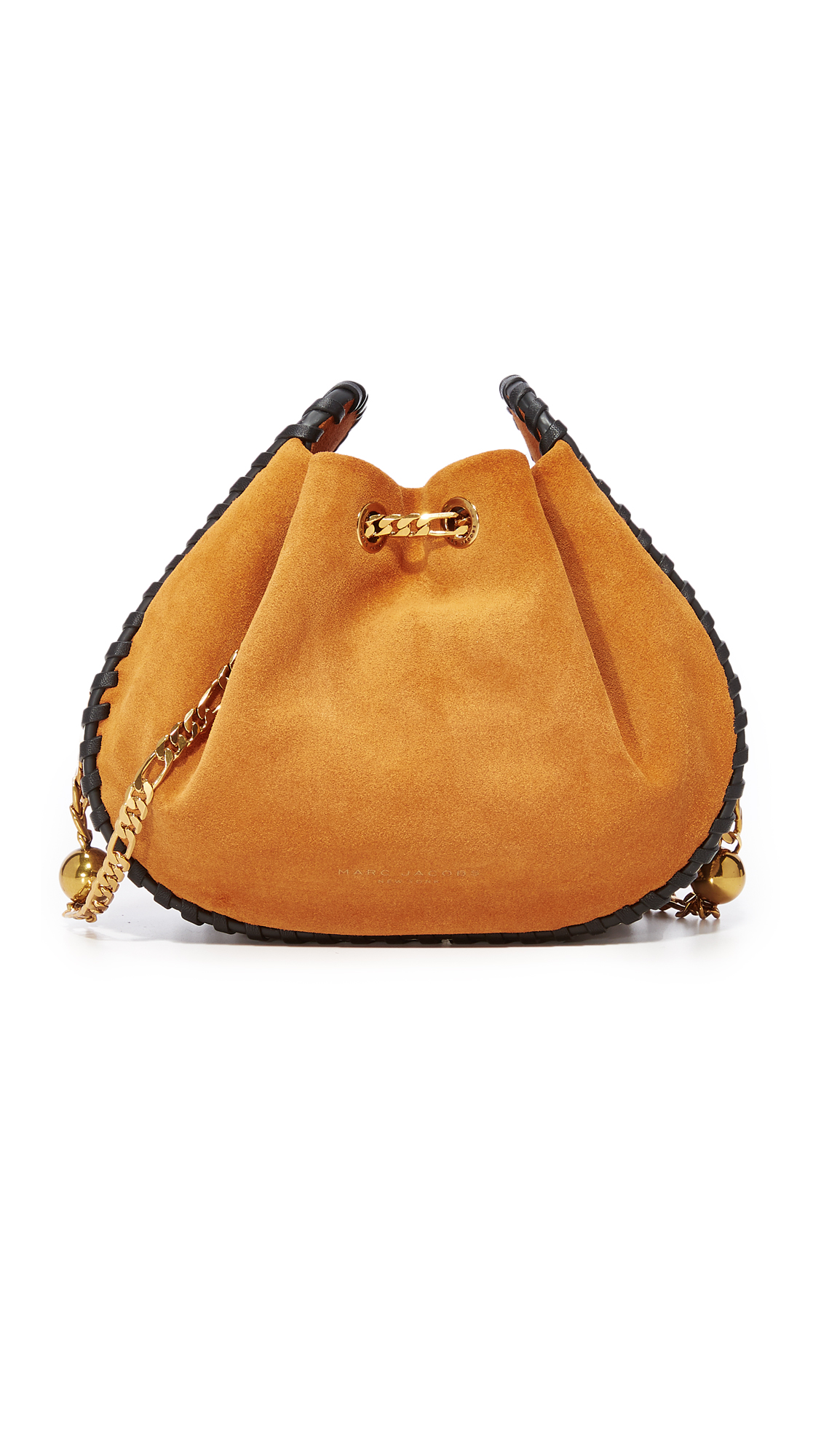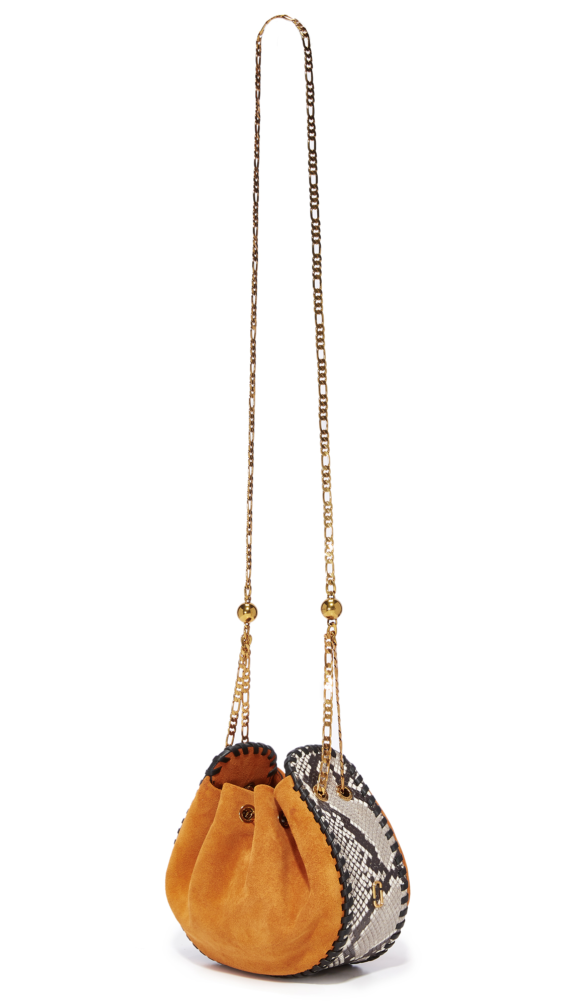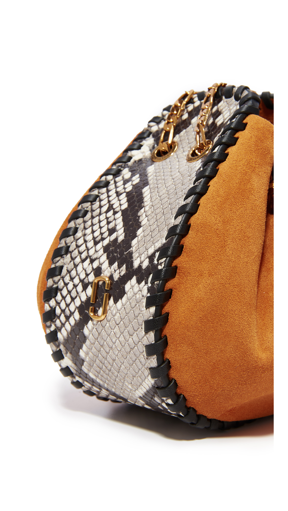 A suede Marc Jacobs shoulder bag with whipstitched seams and python-embossed trim. Chain drawstring shoulder strap. Unlined. Dust bag included.