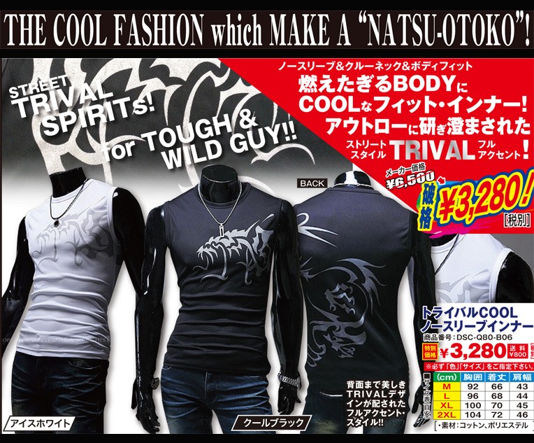 燃えたぎるBODYにCOOLなフィット・インナー! 通常7020円(税込)の処、50%OFF特別価格3545円(税込)にて限定販売!ノースリーブ&クールネック&ボディフィット! アウトローに研ぎ澄まされたストリートスタイルTRIVALフルアクセント!背面まで美しきTRIVALデザインが配されたフルアクセント・スタイル!! STREET TRAIVAL SPITIT's! for TOUGH&WILD GUY!!
