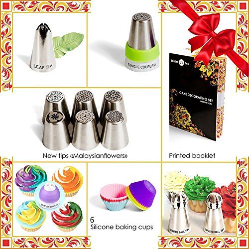 - ★ INCLUDES EVERYTHING YOU NEED : With our Baking Suppliers Set, consisting of 25 Icing Nozzles (including 6 new Malaysian icing nozzles , 7 new designs 2018 and 2 Sphere Balls Tips), 6 Silicone cups, 30 Disposable Pastry bags, Printed booklet, Leaf Tip, 2 Couplers, Reusable Silicone Bag you can create beautiful icing designs quickly and easily.