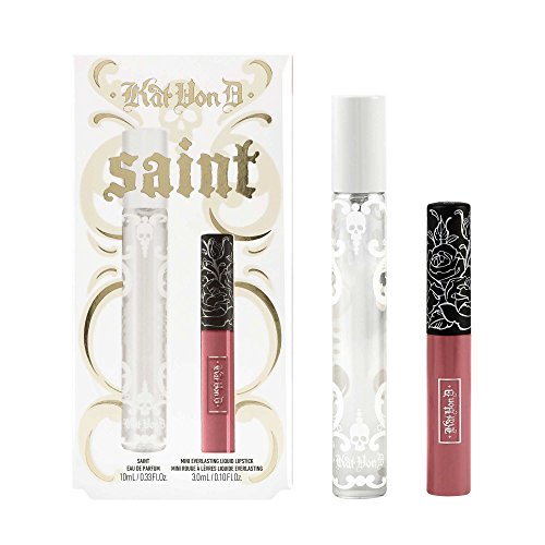 -. Binding : Misc. -. Brand : Kat Von D by Sephora -. Color : Saint -. EAN : 0696213491997 -. Feature : Limited Edition Kat Von D Gift Set / Saint / Kat Von D Saint Eau de Parfum Travel Spray 0.33 oz/ 10 ml / Kat Von D Saint Everlasting Liquid Lipstick 0.10 oz/ 3 ml / Boxed Set-2 Piece -. IsAdultProduct : 0 -. Label : Kat Von D Brand Cosmetics Company Dist. -. Manufacturer : Kat Von D Brand Cosmetics Company Dist. -. MPN : 0040 -. NumberOfItems : 1 -. PackageQuantity : 1 -. PartNumber : 0040 -. ProductGroup : Beauty -. ProductTypeName : BEAUTY -. Publisher : Kat Von D Brand Cosmetics Company Dist. -. Size : Travel Mini -. Studio : Kat Von D Brand Cosmetics Company Dist. -. Title : Kat Von D Lipstick and Fragrance Duo Saint -. UPC : 696213491997