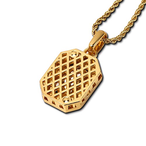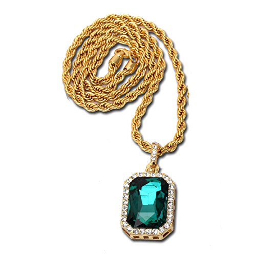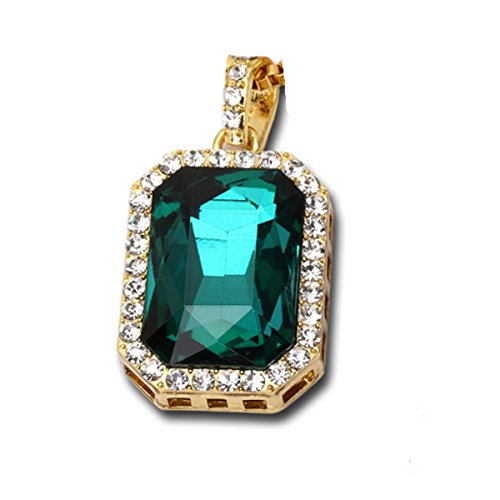 14K Gold Plate Iced Out Hip Hop Emerald Green Gem Jewelry, Bling Bling Pendant Necklace for Men 30" Chain Included