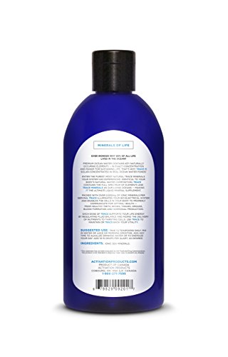 -. Binding : Health and Beauty -. Brand : Activation Products -. EAN : 0679829092017 -. Feature : BALANCE: Restore Balance to your Bio-Electric System with Ionic Sea Minerals. / RESTORE: Supply your body with the Most Bio-Available Minerals Essential for Good Health. / CELL MAINTENANCE: Every organ and cell requires maintaining a supply of Trace minerals for a healthy life from Healthy Teeth, Bones, Tissues, Organs, Blood Formation and Hormonal Production. / FULL SPECTRUM: Trace Pure Ocean Minerals contains the Full Spectrum of Elements and Trace Minerals of our Living Oceans. / SUPERIOR QUALITY & PURITY: Our Trace Pure Ocean Minerals is one of the purest natural Trace Liquid Mineral Supplements available 100% Pure & Tested. No Chemicals, No Fillers, No Animal Testing. -. IsAdultProduct : 0 -. Label : Activation Products -. Manufacturer : Activation Products -. MPN : APPTRACE235 -. PackageQuantity : 1 -. PartNumber : APPTRACE235 -. ProductGroup : Health and Beauty -. ProductTypeName : HEALTH_PERSONAL_CARE -. Publisher : Activation Products -. Studio : Activation Products -. Title : Trace Pure Ocean Minerals by Activation Products, Ionic Sea Minerals, Restore Balance and Energy, Metabolic Function, 60 Day Money Back Guarantee, 8 oz -. UPC : 679829092017