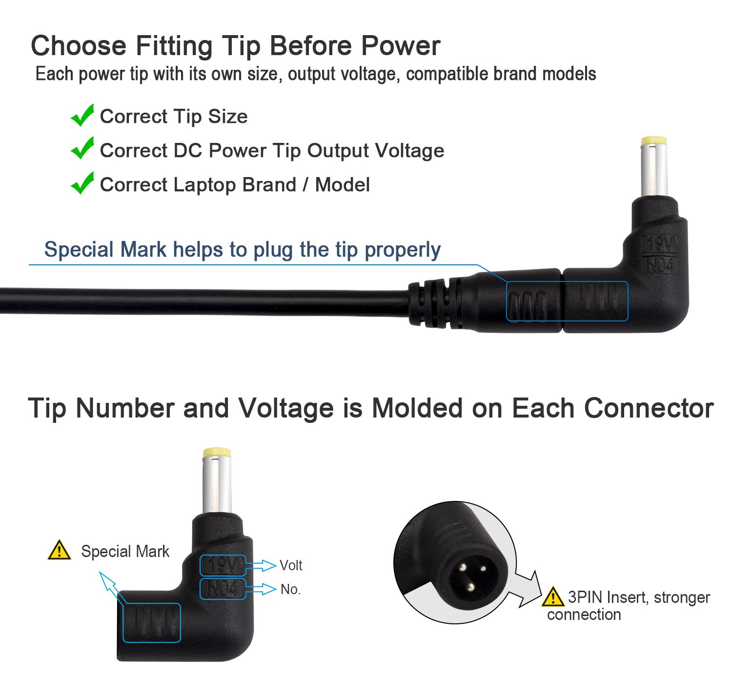 Before use, please confirm the shape of bolt, ampere and connector insertion port, compatible model, output compatible with notebook computer.