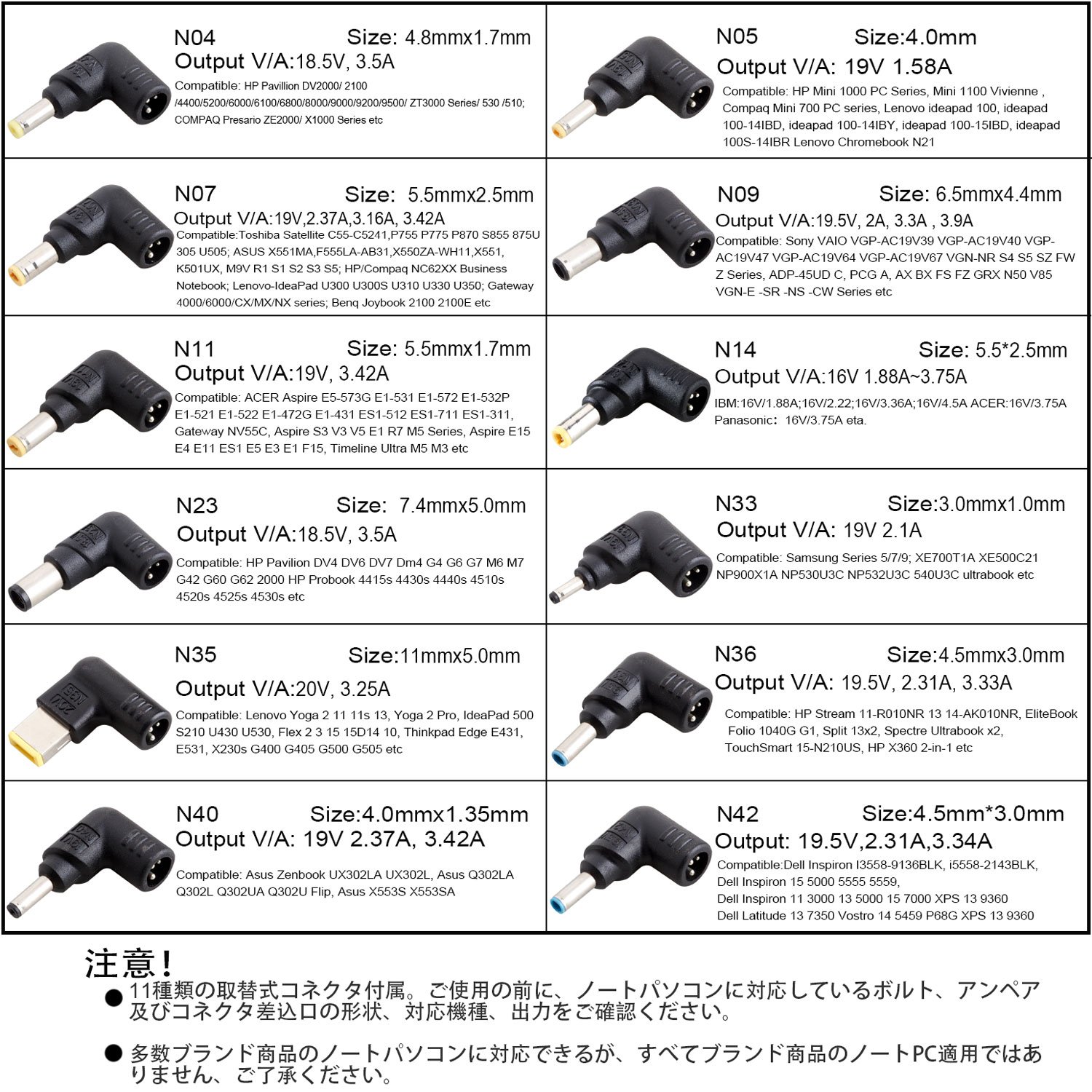 There are 12 kinds of attached plugs, Toshiba dynabook 19V, hp 19.5V, dell 19.5V, lenovo 20V, sony 19.5V, VersaProacer Fujitsu 19V, Asus 19V and so on.